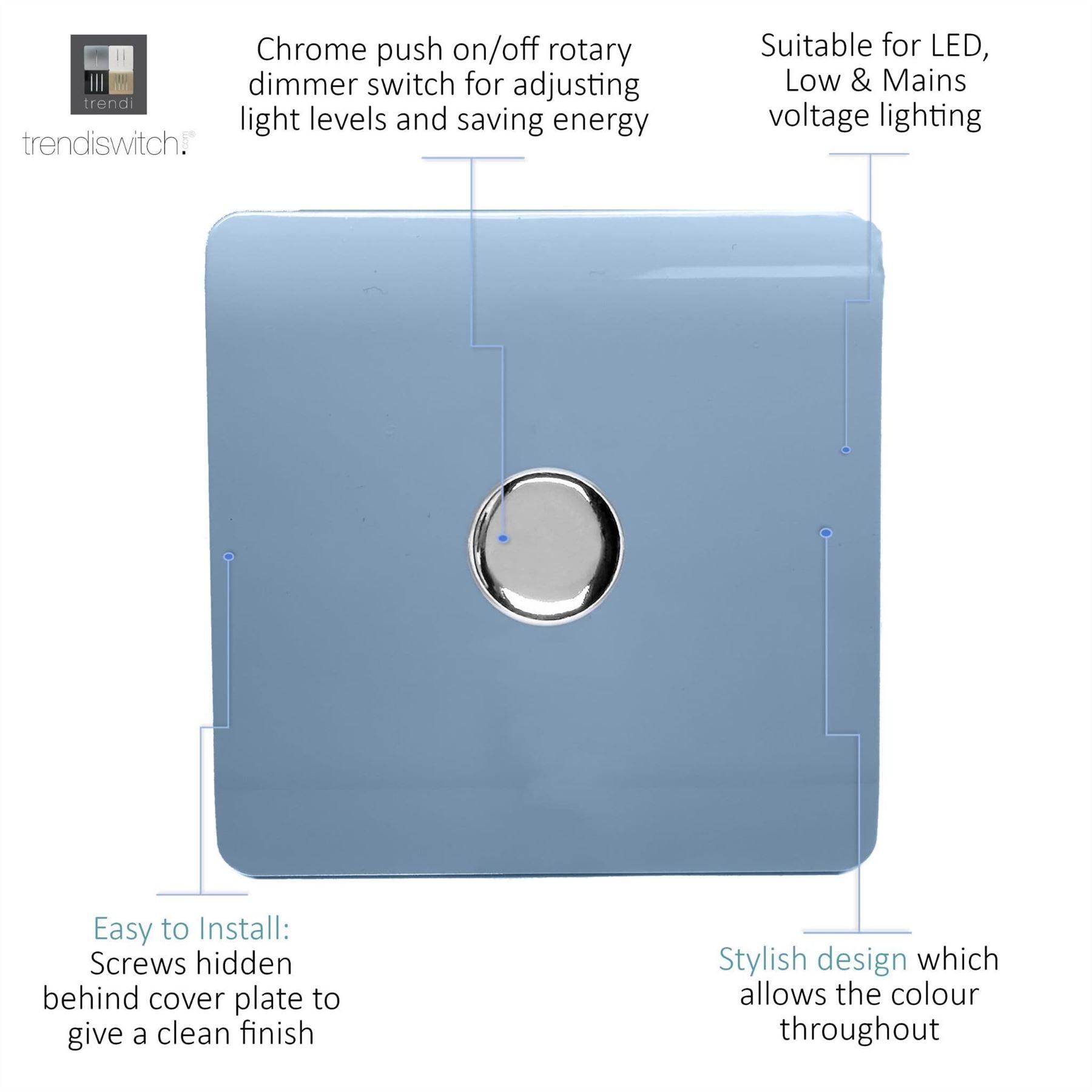 Upgrade your lighting with the Trendi Switch 1 Gang 2/Way 100w LED Dimmer Light Switch, a sleek and stylish solution for modern interiors. Designed for dimmable LED bulbs, this rotary push on/off dimmer offers smooth, reliable control with a maximum load of 5/100w LEDs. Crafted with a screwless faceplate and a premium chrome dimmer knob, the Trendi LED dimmer switch is as functional as it is elegant / making it the perfect choice for contemporary homes. Key Features: Product Colour: Sky Blue 1/Gang 2/Way Push On/Off Rotary LED Dimmer (5/100w LED load capacity) Ideal for LED lighting / tested for 0/10 dimmable LED bulbs Chrome knob finish for a premium designer look Screwless faceplate with included back and front plates Ultra/slim profile: 89 x 89 x 48mm (Faceplate depth: 8mm) Lightweight and durable: 100g Easy installation / fits a 25mm back box Operating voltage: 220/250V AC 5/Year Warranty / British made, certified & tested to BS EN 60669/2/1 Safe for indoor, domestic lighting circuits Safety Information: For indoor use only Use only with dimmable LED light bulbs (not suitable for non/dimmable fluorescents, wire/wound or toroidal transformers, TRIAC dimmable loads, or electric motors) Do not overload the switch The Trendi Switch LED Dimmer combines modern design with advanced functionality, giving you a reliable and stylish lighting solution. Whether you're upgrading a single room or renovating your entire home, this designer chrome dimmer switch adds a touch of elegance to any space / #definedbydesign.