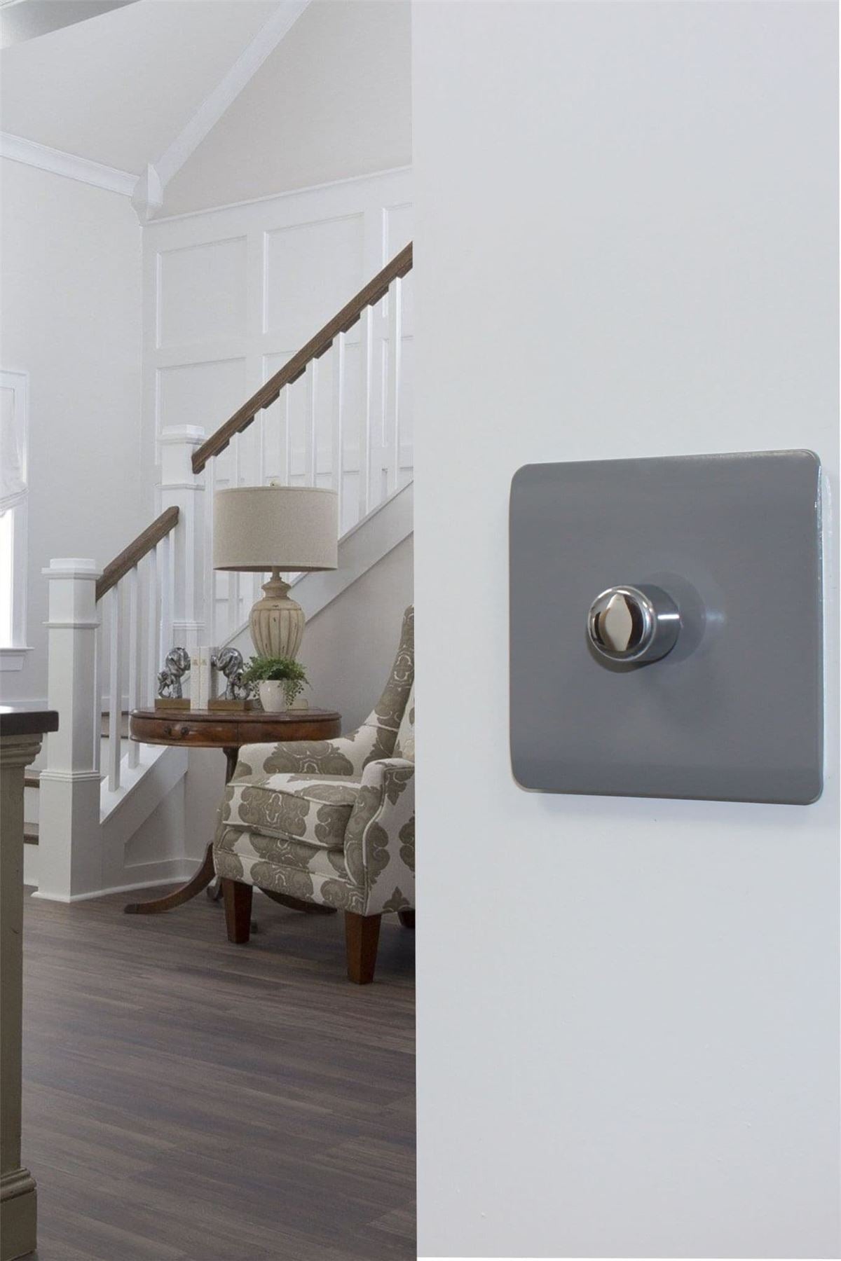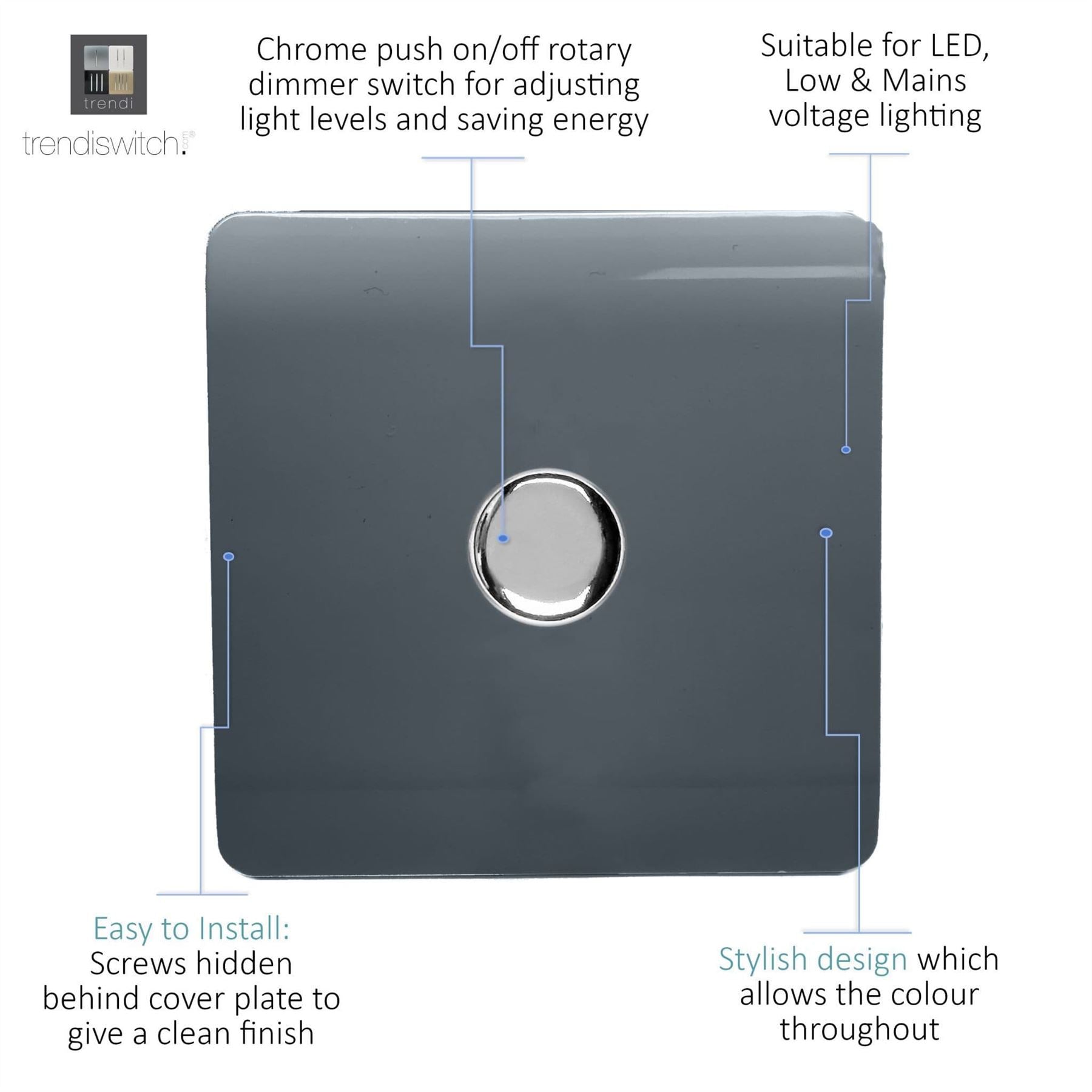 Upgrade your lighting with the Trendi Switch 1 Gang 2/Way 100w LED Dimmer Light Switch, a sleek and stylish solution for modern interiors. Designed for dimmable LED bulbs, this rotary push on/off dimmer offers smooth, reliable control with a maximum load of 5/100w LEDs. Crafted with a screwless faceplate and a premium chrome dimmer knob, the Trendi LED dimmer switch is as functional as it is elegant / making it the perfect choice for contemporary homes. Key Features: Product Colour: Warm Grey 1/Gang 2/Way Push On/Off Rotary LED Dimmer (5/100w LED load capacity) Ideal for LED lighting / tested for 0/10 dimmable LED bulbs Chrome knob finish for a premium designer look Screwless faceplate with included back and front plates Ultra/slim profile: 89 x 89 x 48mm (Faceplate depth: 8mm) Lightweight and durable: 100g Easy installation / fits a 25mm back box Operating voltage: 220/250V AC 5/Year Warranty / British made, certified & tested to BS EN 60669/2/1 Safe for indoor, domestic lighting circuits Safety Information: For indoor use only Use only with dimmable LED light bulbs (not suitable for non/dimmable fluorescents, wire/wound or toroidal transformers, TRIAC dimmable loads, or electric motors) Do not overload the switch The Trendi Switch LED Dimmer combines modern design with advanced functionality, giving you a reliable and stylish lighting solution. Whether you're upgrading a single room or renovating your entire home, this designer chrome dimmer switch adds a touch of elegance to any space / #definedbydesign.