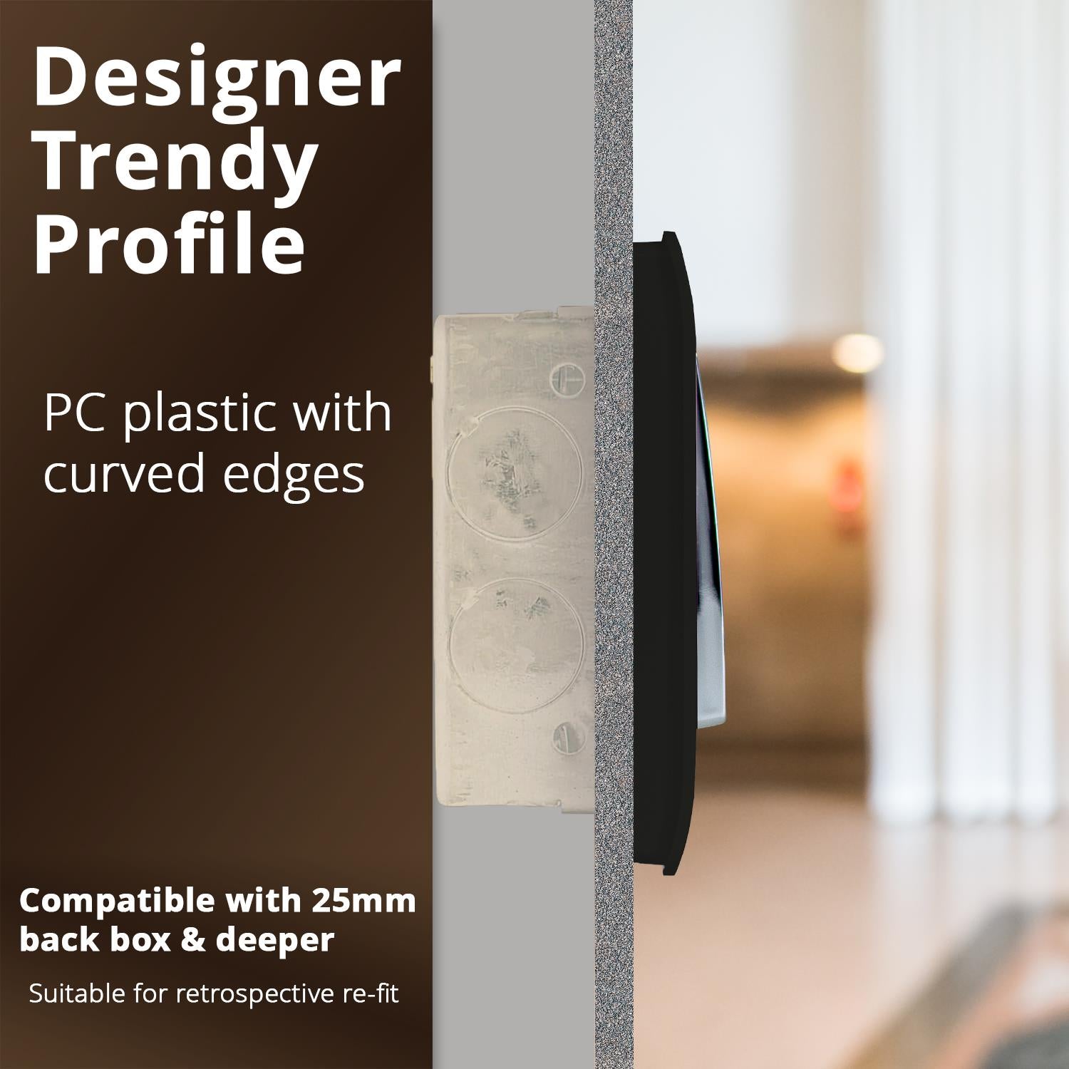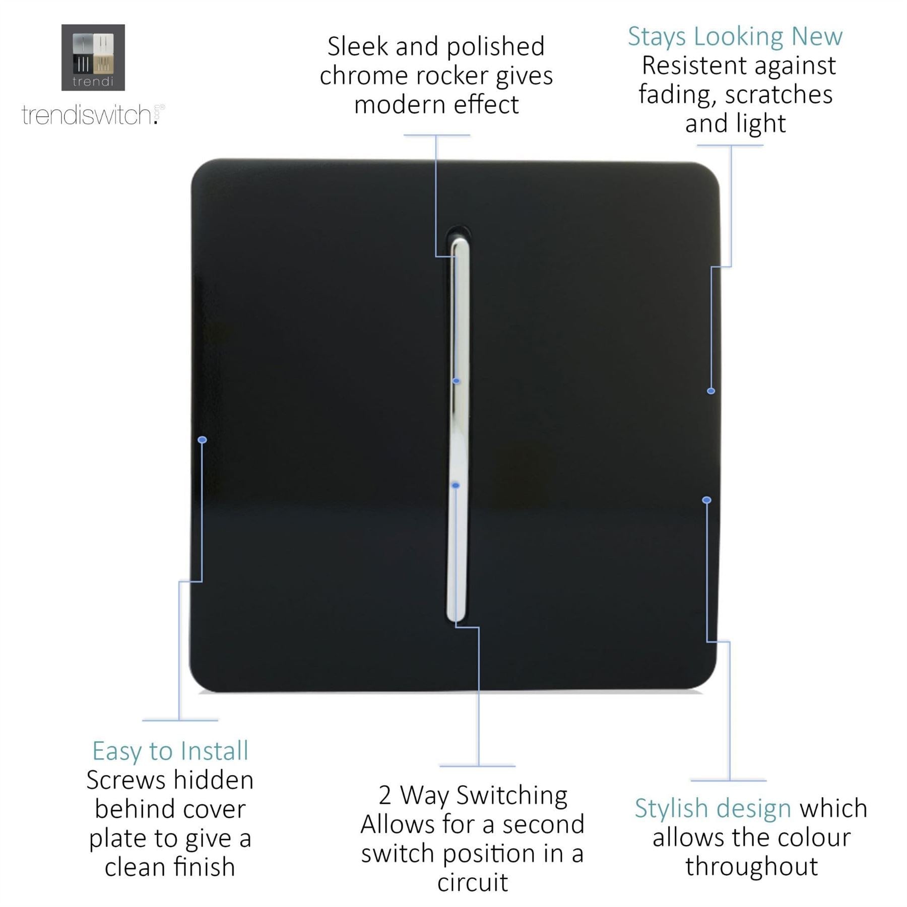 The Trendi Switch range of 1 gang 1 or 2 way rocker light switches comprise of a sleek chrome rocker switch on a "screwless" plate displaying the complete colour of the products. This is supported by a back frame that houses the screw holes & module for the product to be installed into compatible back boxes and wiring.