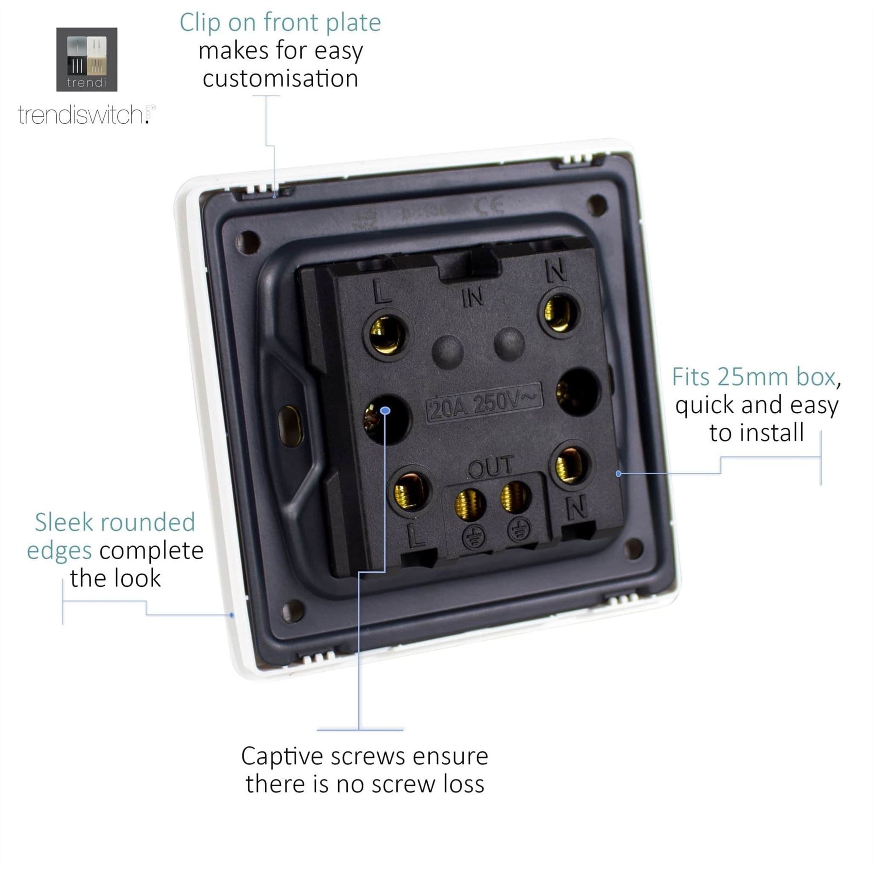 The Trendi Switch range of 1 gang 20 amp switches comprise of a sleek chrome rocker switch on a "screwless" plate displaying the complete colour of the products. This is supported by a back frame that houses the screw holes & module for the product to be installed into compatible back boxes and wiring.