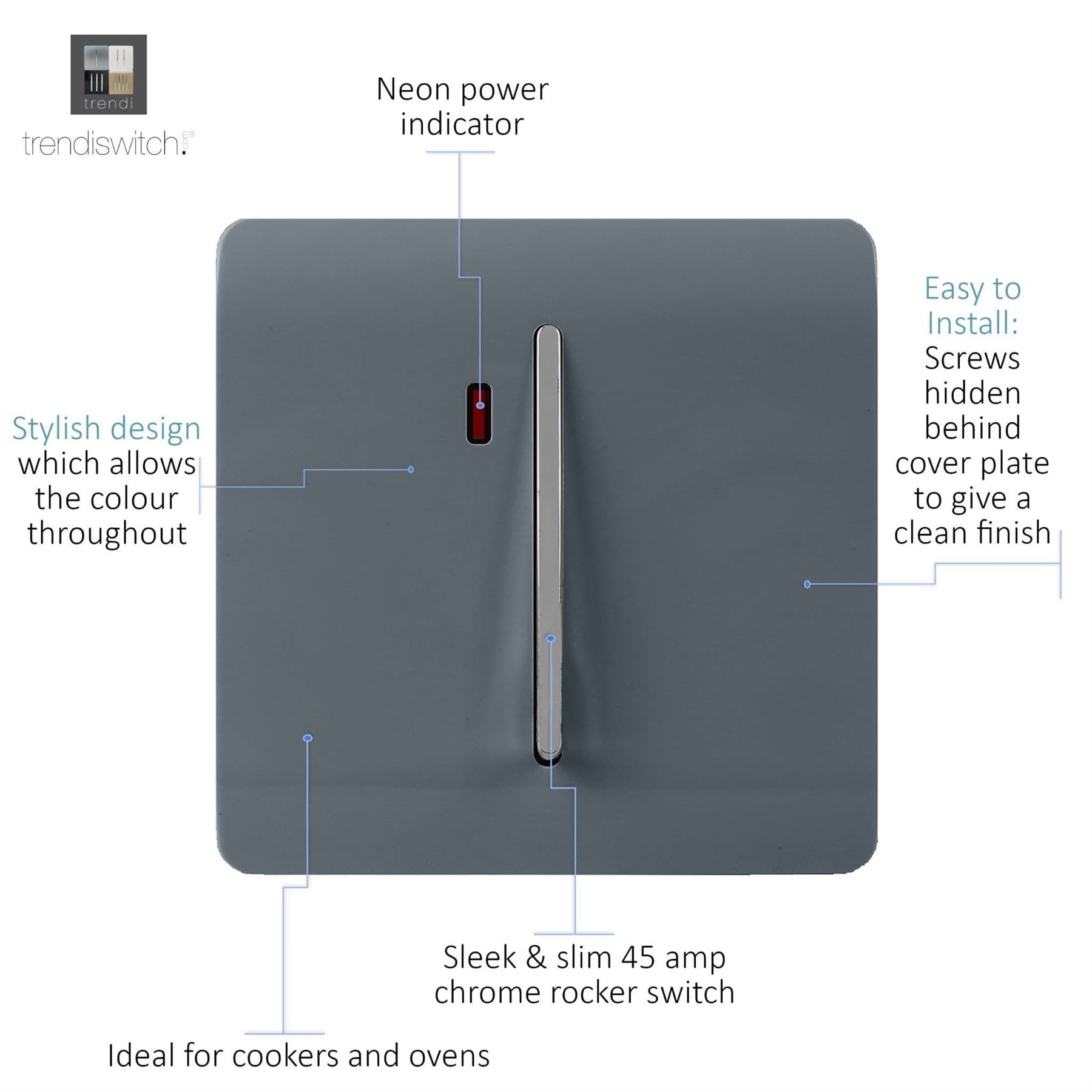 The Trendi Switch range of 1 gang 20 amp switches comprise of a sleek chrome rocker switch on a "screwless" plate displaying the complete colour of the products. This is supported by a back frame that houses the screw holes & module for the product to be installed into compatible back boxes and wiring.
