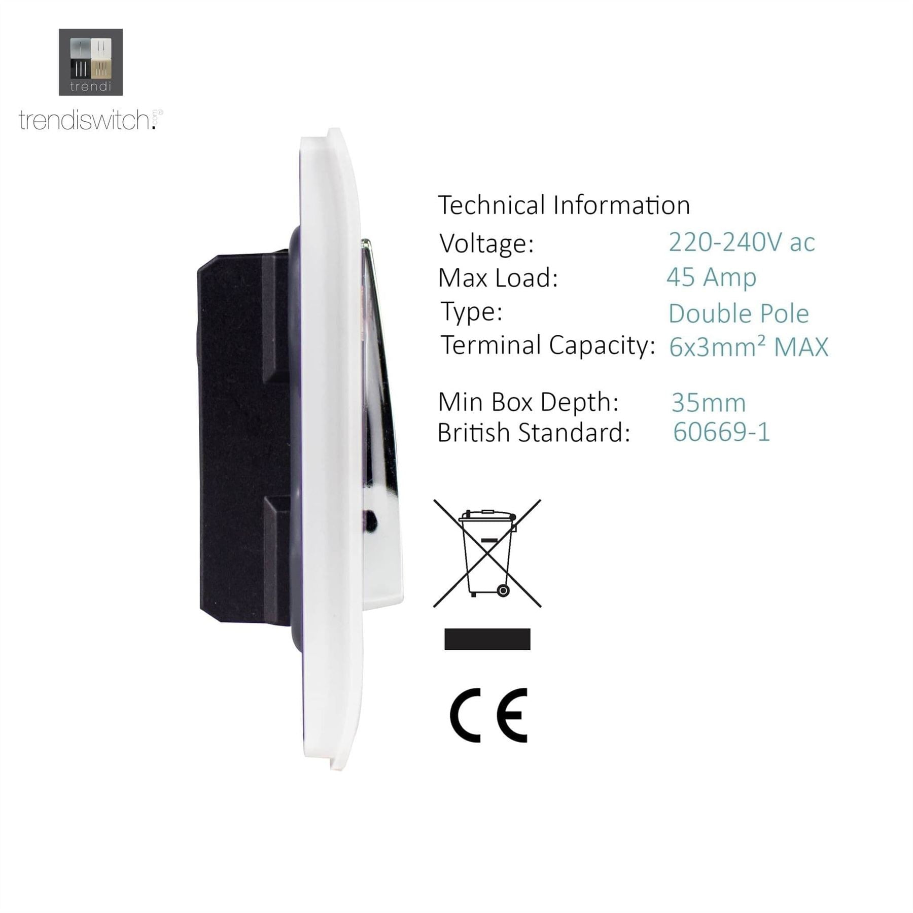 The Trendi Switch range of 1 gang 45 amp cooker switches comprise of a sleek chrome rocker switch on a "screwless" plate displaying the complete colour of the products. This is supported by a back frame that houses the screw holes & module for the product to be installed into compatible back boxes and wiring.