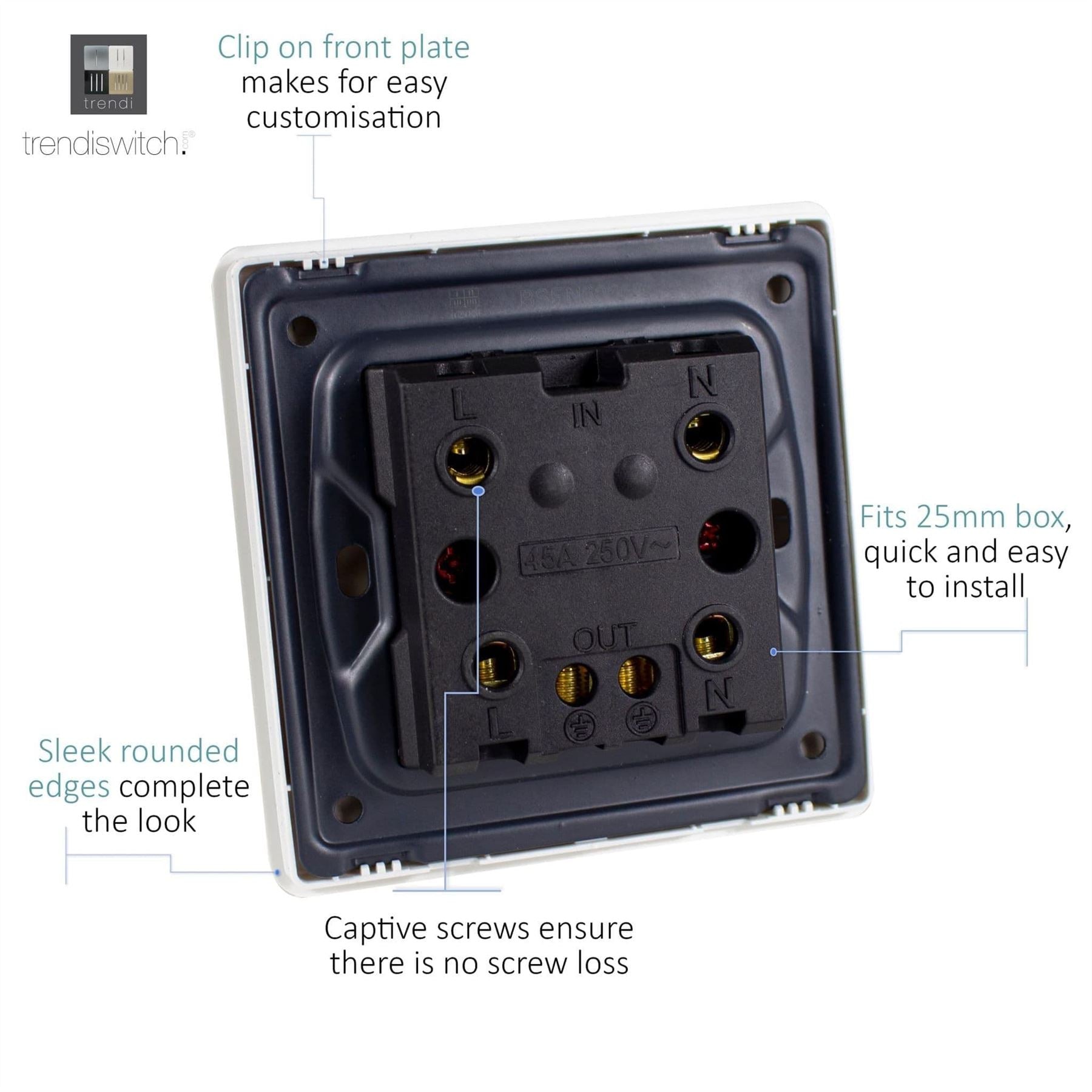 The Trendi Switch range of 1 gang 45 amp cooker switches comprise of a sleek chrome rocker switch on a "screwless" plate displaying the complete colour of the products. This is supported by a back frame that houses the screw holes & module for the product to be installed into compatible back boxes and wiring.
