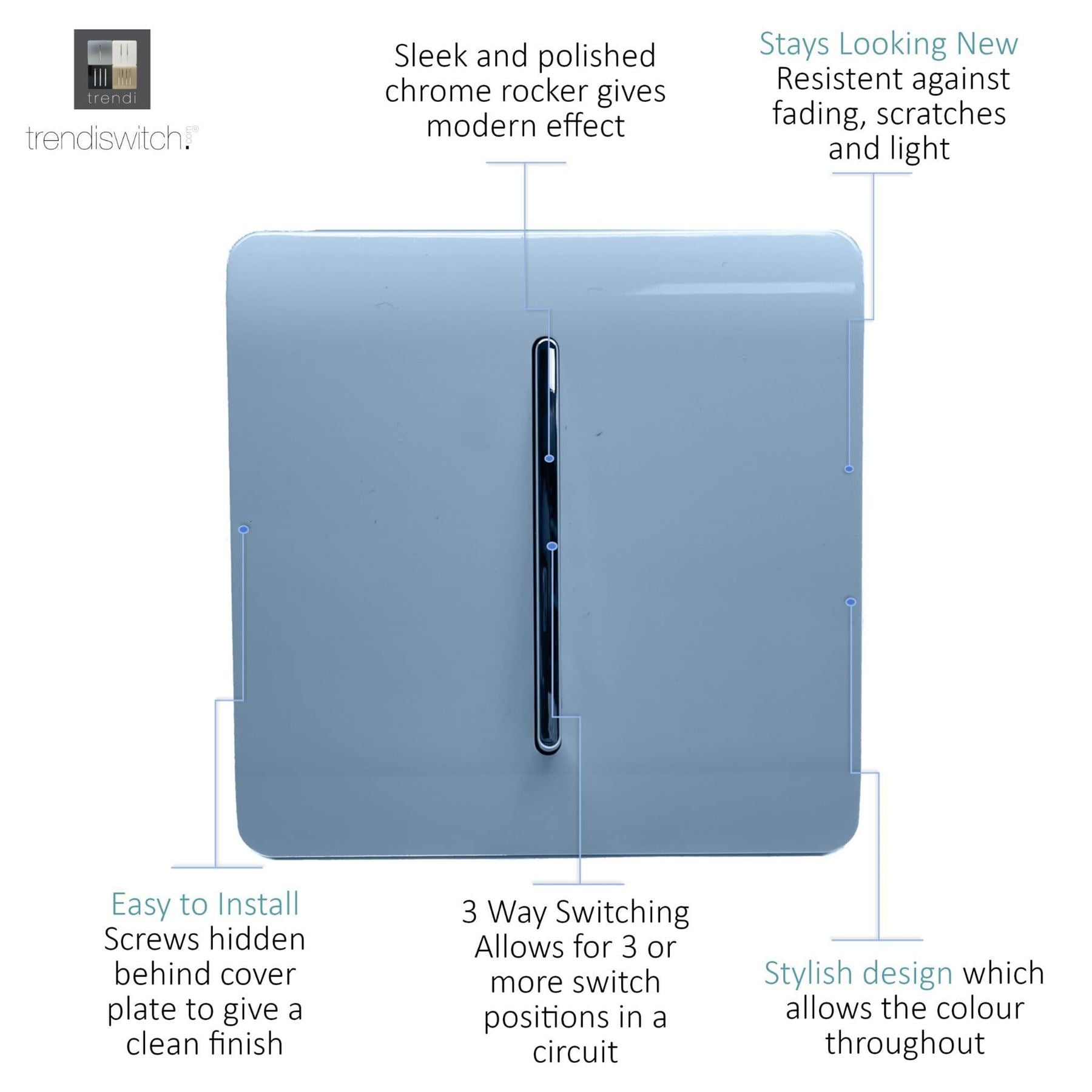 The Trendi Switch range of 1 gang intermediate (also known as 3 way) rocker light switches comprise of a sleek chrome rocker switch on a "screwless" plate displaying the complete colour of the products. This is supported by a back frame that houses the screw holes & module for the product to be installed into compatible back boxes and wiring.