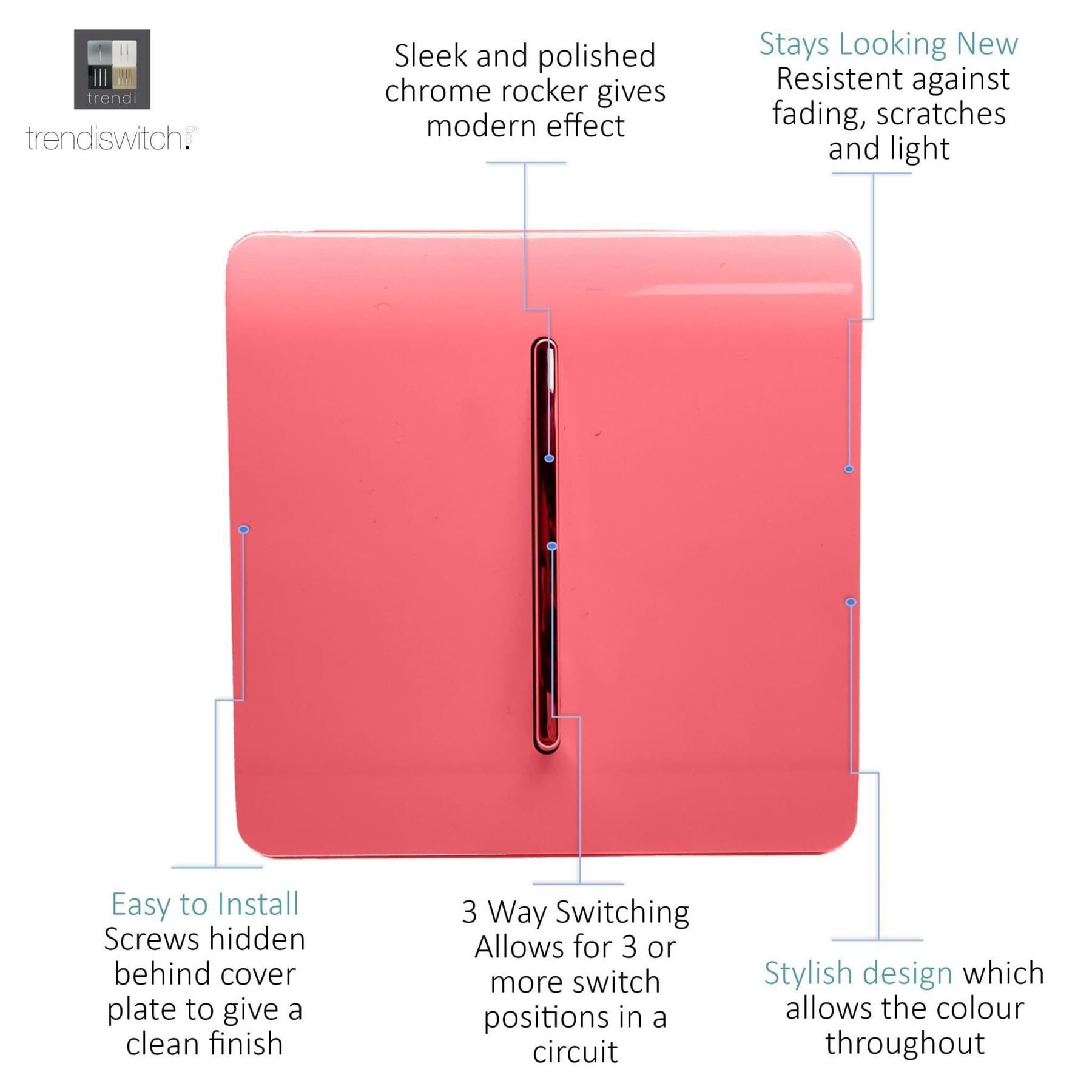 The Trendi Switch range of 1 gang intermediate (also known as 3 way) rocker light switches comprise of a sleek chrome rocker switch on a "screwless" plate displaying the complete colour of the products. This is supported by a back frame that houses the screw holes & module for the product to be installed into compatible back boxes and wiring.
