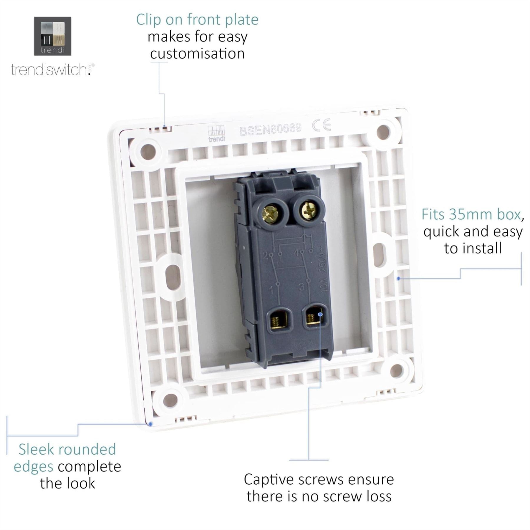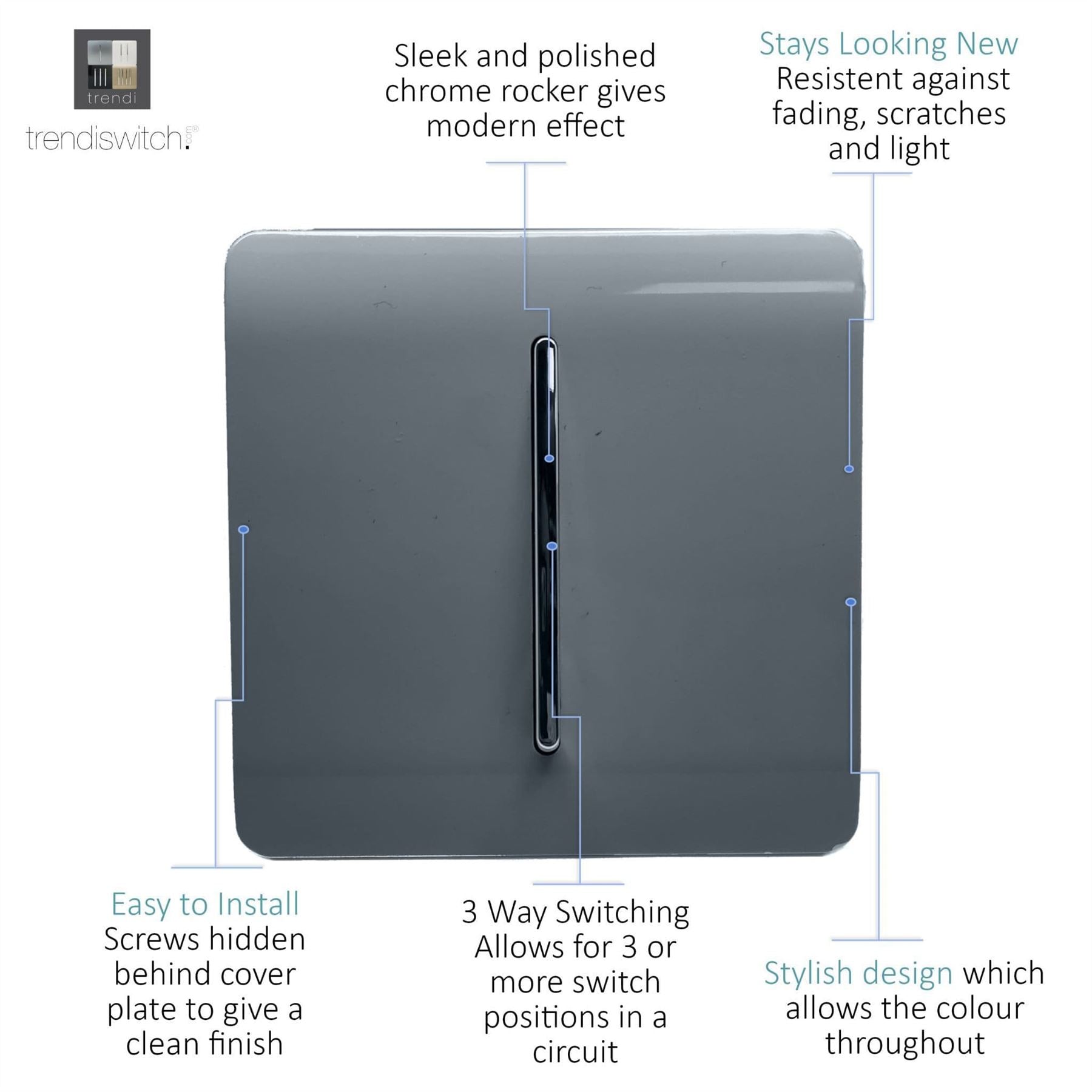The Trendi Switch range of 1 gang intermediate (also known as 3 way) rocker light switches comprise of a sleek chrome rocker switch on a "screwless" plate displaying the complete colour of the products. This is supported by a back frame that houses the screw holes & module for the product to be installed into compatible back boxes and wiring.