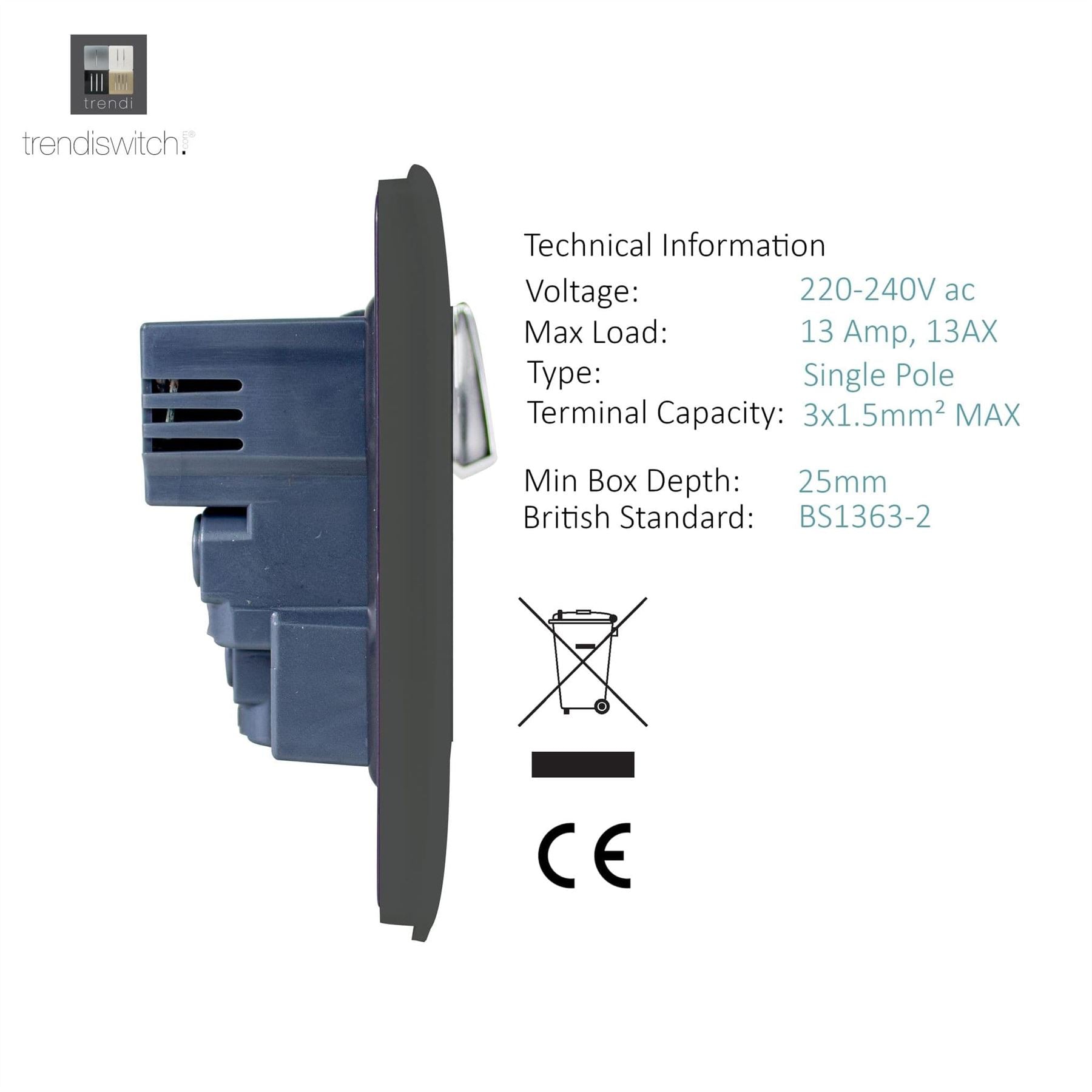 The Trendi Switch range of 1 gang 13 amp USB plug sockets comprise of a sleek chrome rocker switch on a "screwless" plate displaying the complete colour of the products. This is supported by a back frame that houses the screw holes & module for the product to be installed into compatible back boxes and wiring.