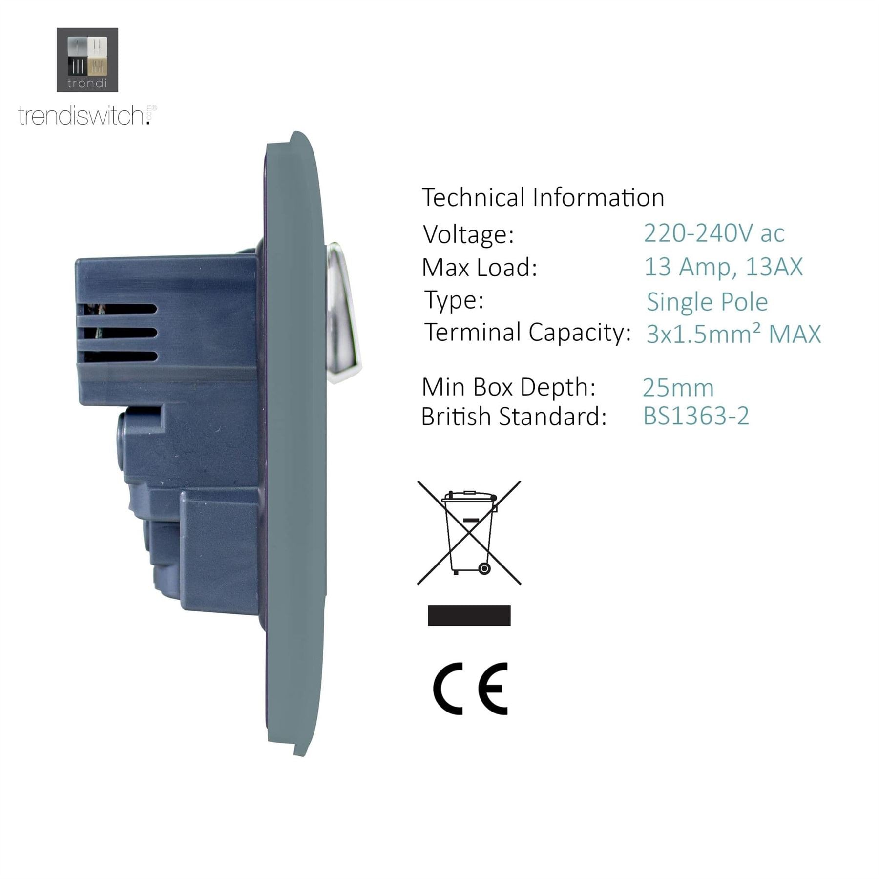 The Trendi Switch range of 1 gang 13 amp USB plug sockets comprise of a sleek chrome rocker switch on a "screwless" plate displaying the complete colour of the products. This is supported by a back frame that houses the screw holes & module for the product to be installed into compatible back boxes and wiring.