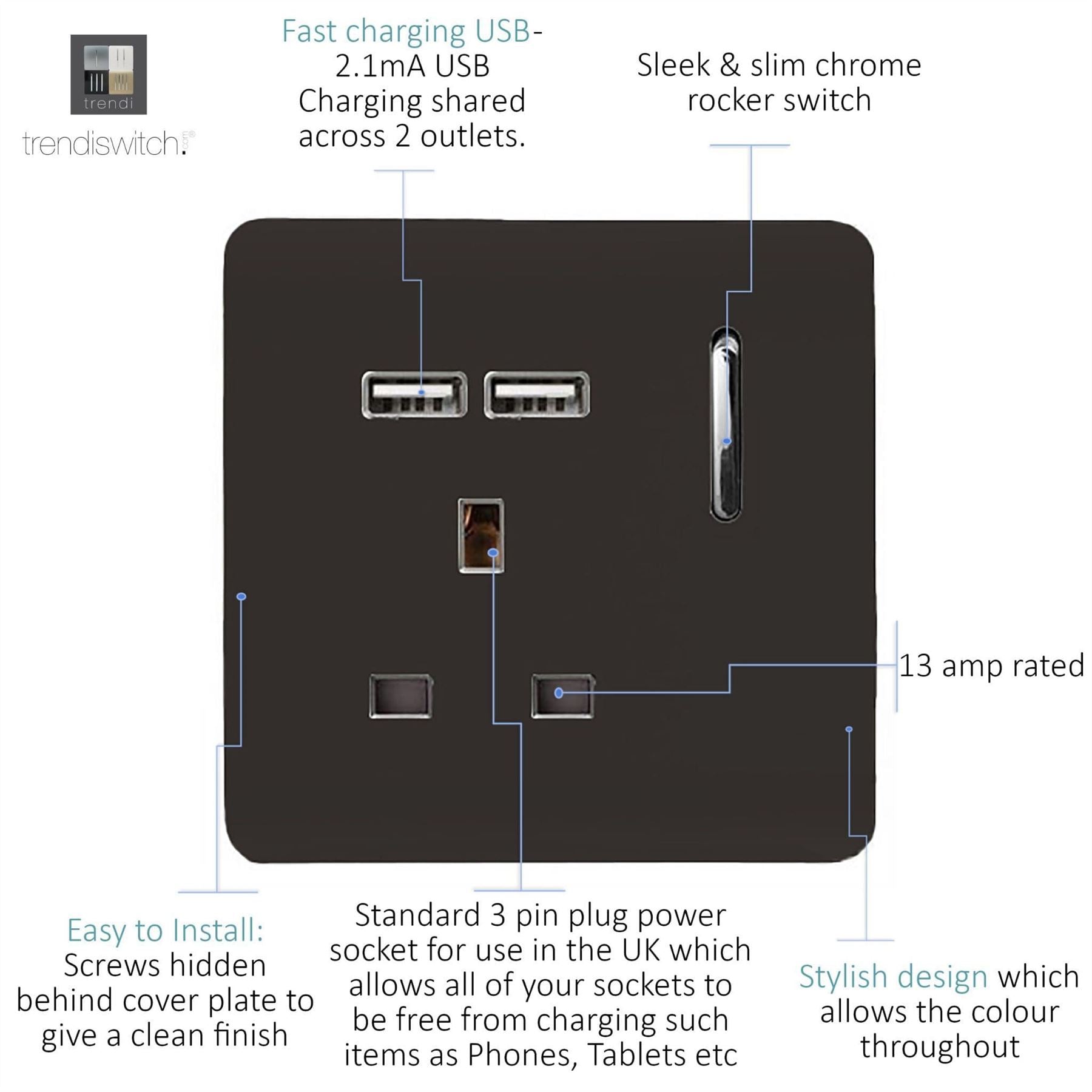 Trendi Switch 1 Gang USB 2100mA Plug Socketin Dark Mocha Brown