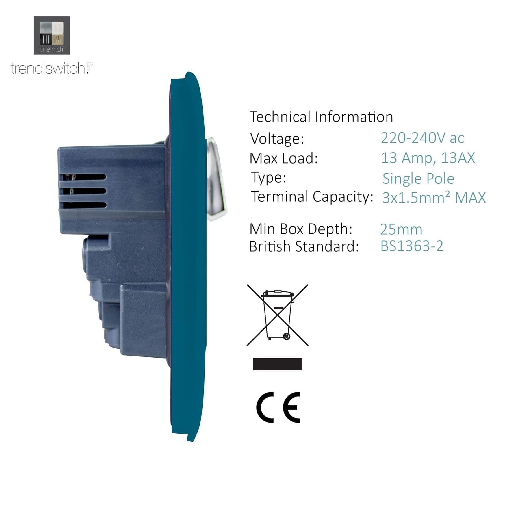 The Trendi Switch range of 1 gang 13 amp USB plug sockets comprise of a sleek chrome rocker switch on a "screwless" plate displaying the complete colour of the products. This is supported by a back frame that houses the screw holes & module for the product to be installed into compatible back boxes and wiring.