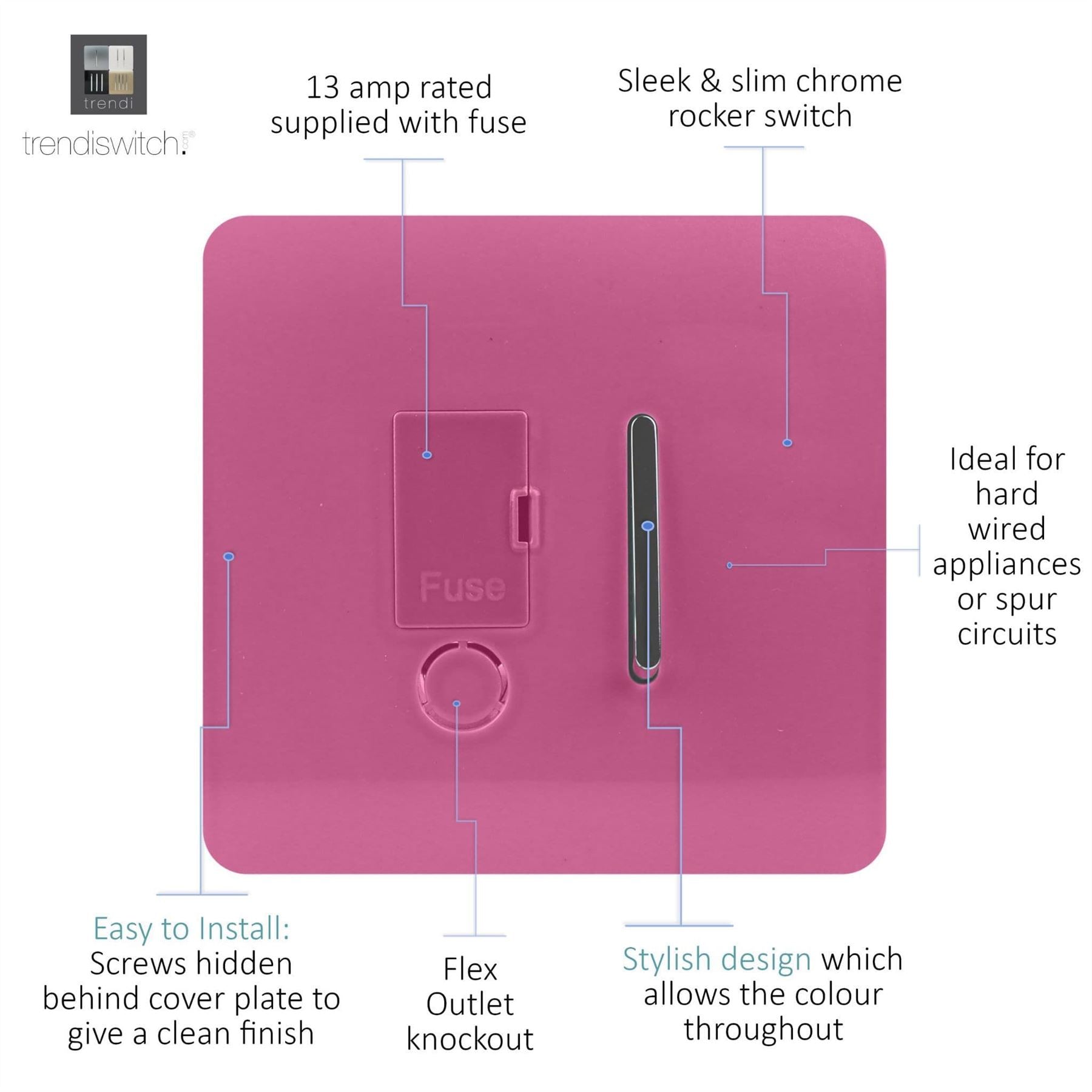 The Trendi Switch range of 13 amp fused spur with flex outlet switches comprise of a sleek chrome rocker switch on a "screwless" plate displaying the complete colour of the products. This is supported by a back frame that houses the screw holes & module for the product to be installed into compatible back boxes and wiring.