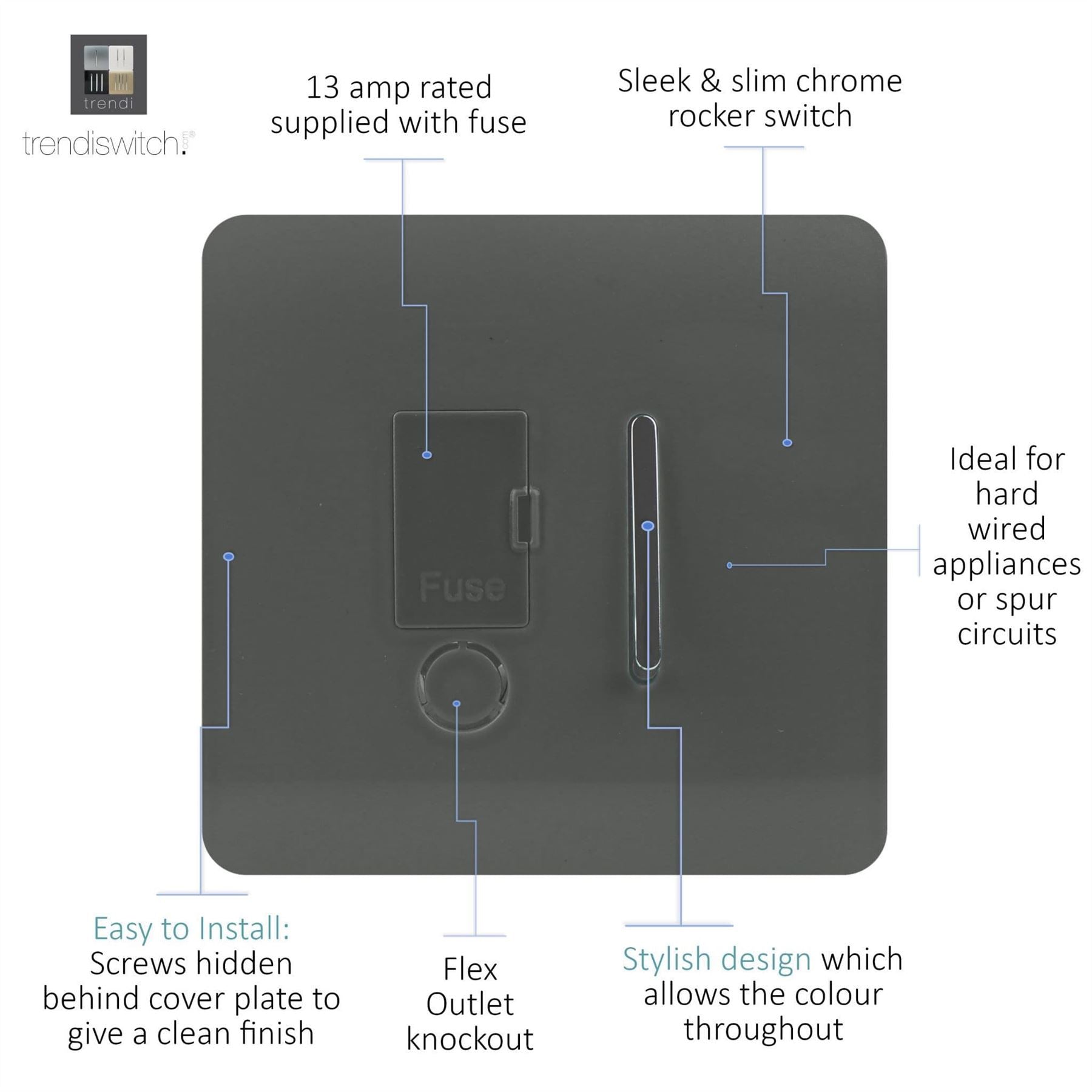 The Trendi Switch range of 13 amp fused spur with flex outlet switches comprise of a sleek chrome rocker switch on a "screwless" plate displaying the complete colour of the products. This is supported by a back frame that houses the screw holes & module for the product to be installed into compatible back boxes and wiring.