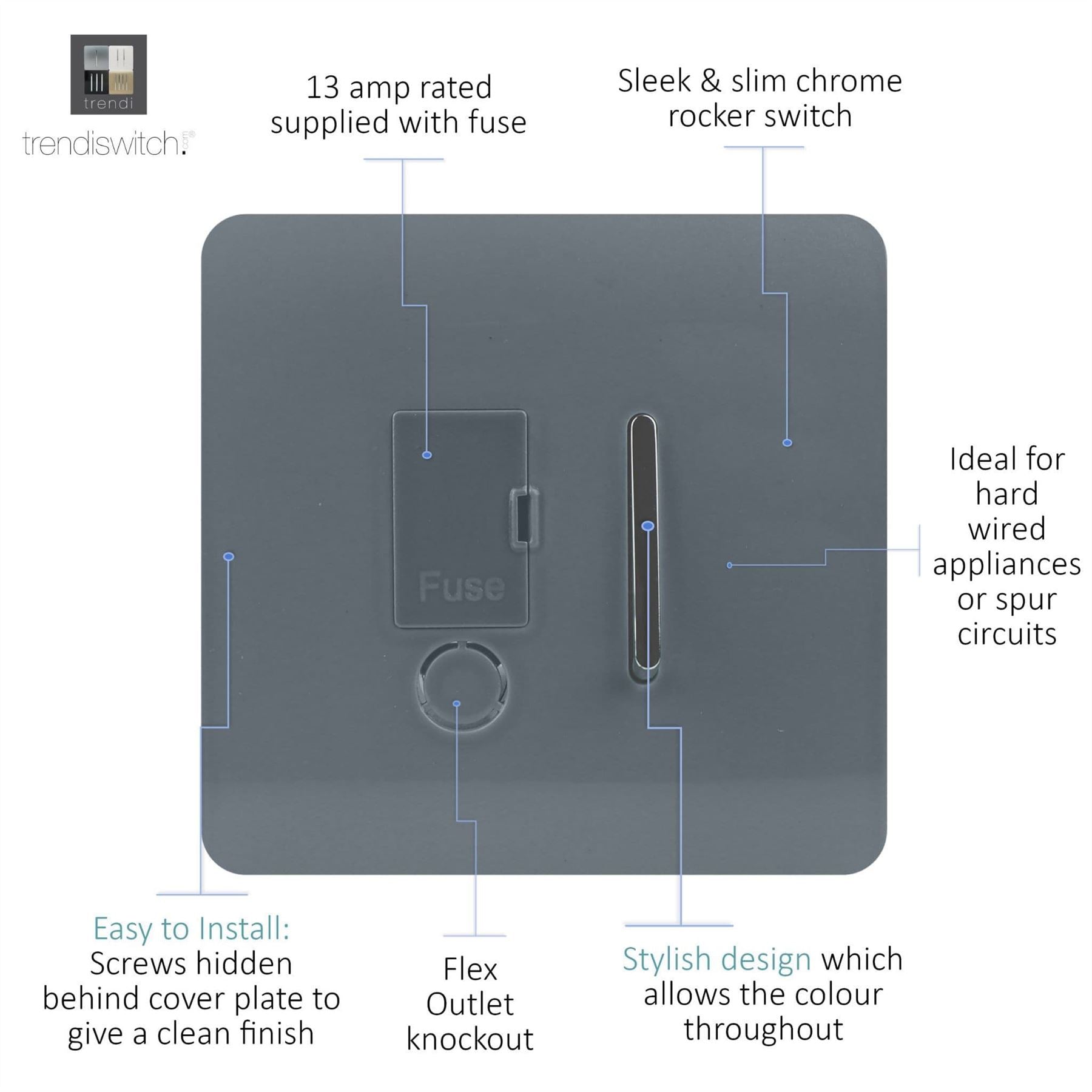 The Trendi Switch range of 13 amp fused spur with flex outlet switches comprise of a sleek chrome rocker switch on a "screwless" plate displaying the complete colour of the products. This is supported by a back frame that houses the screw holes & module for the product to be installed into compatible back boxes and wiring.