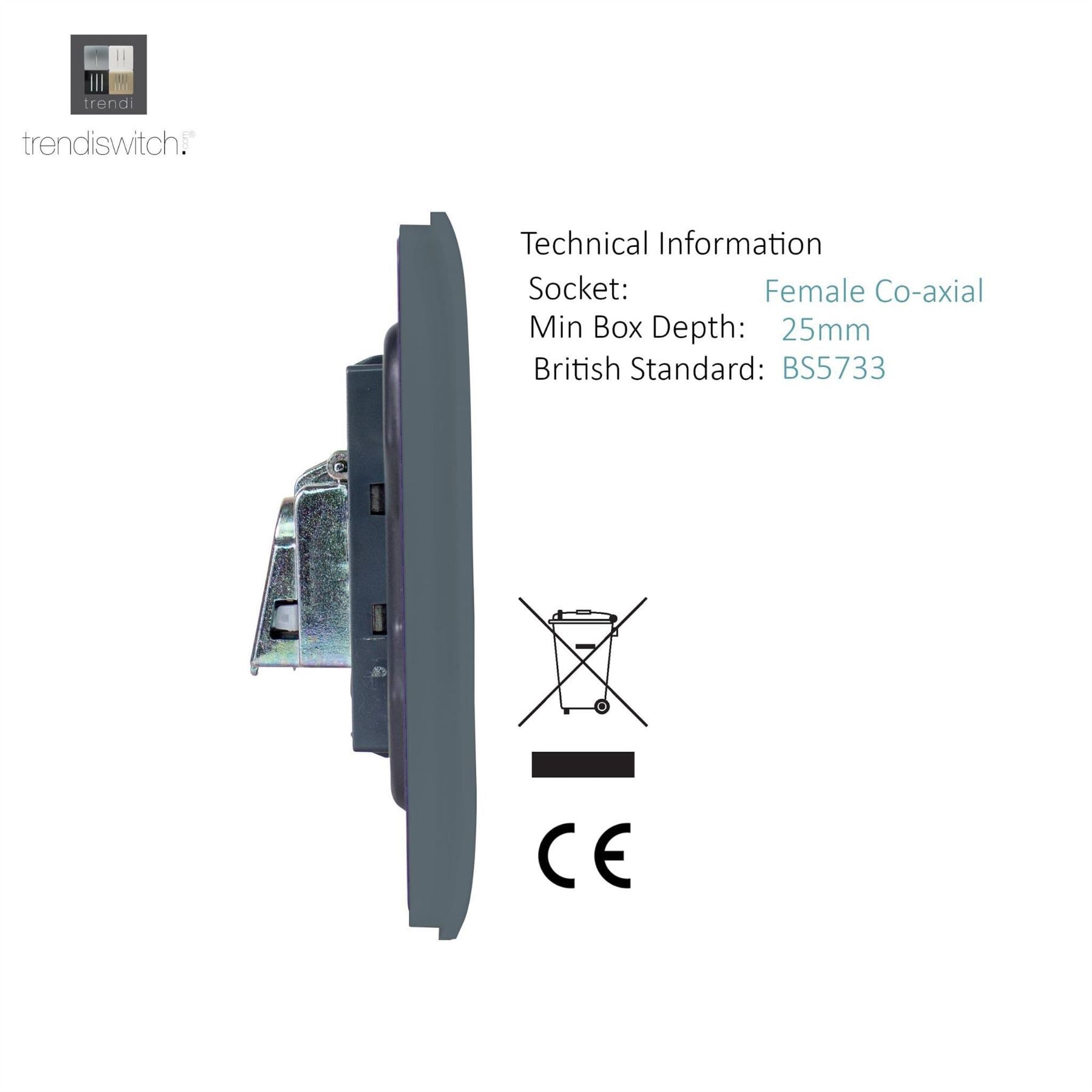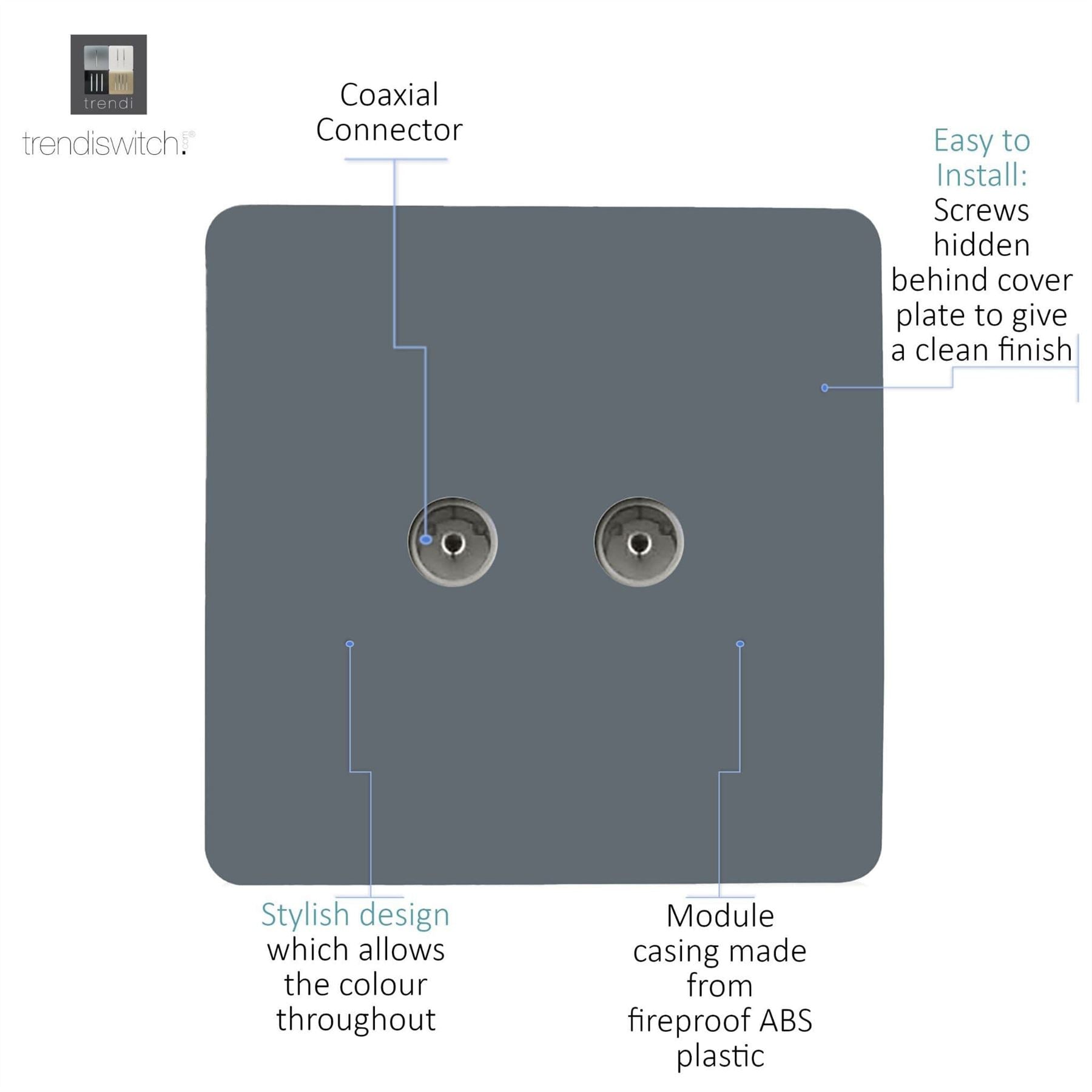 The Trendi Switch range of 2 gang female co-axial television sockets comprise of a "screwless" plate displaying the complete colour of the products. This is supported by a back frame that houses the screw holes & module for the product to be installed into compatible back boxes and wiring.