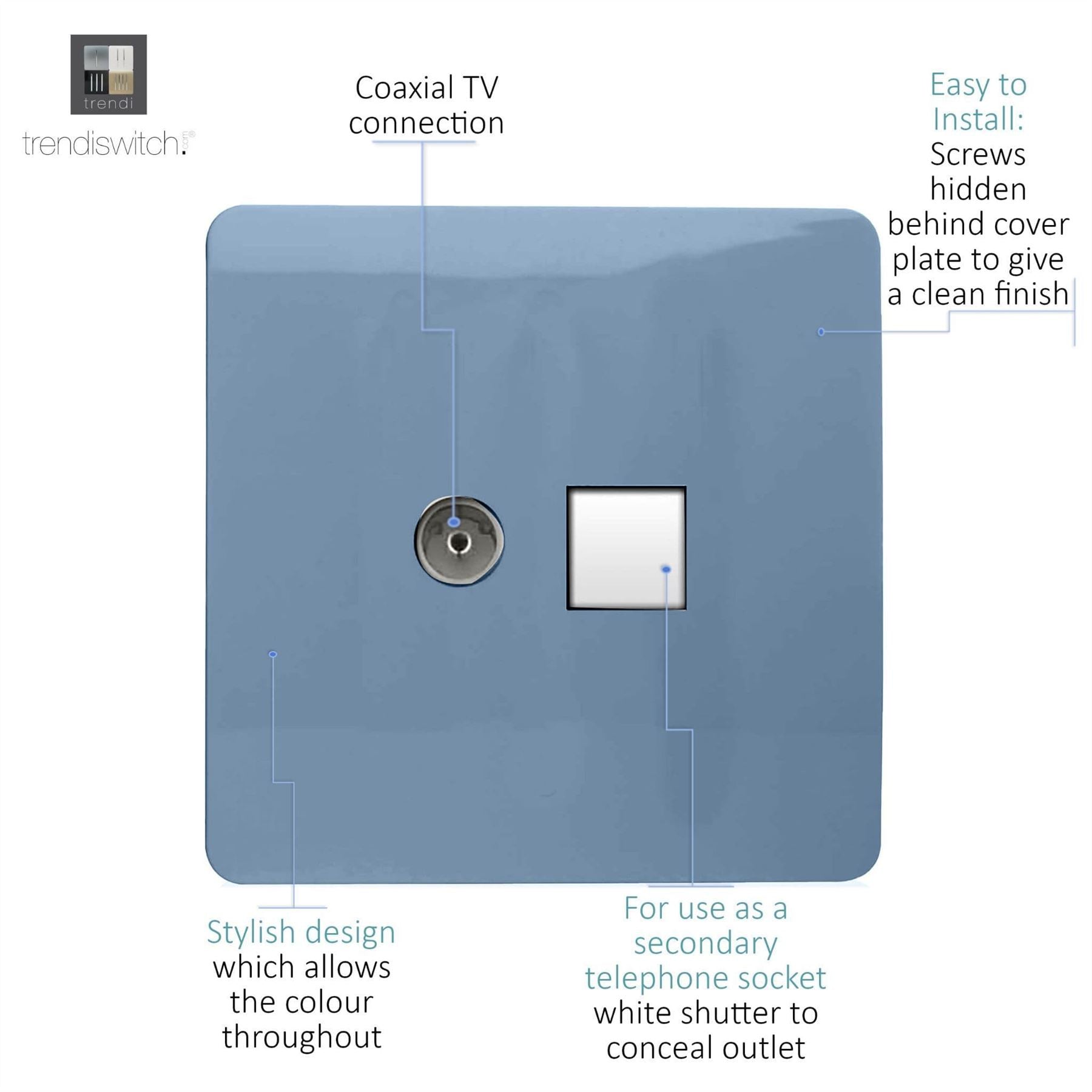 Trendi Switch 2 Gang Female TV Co-Axial & Telephone Slave Sockets in Sky Blue