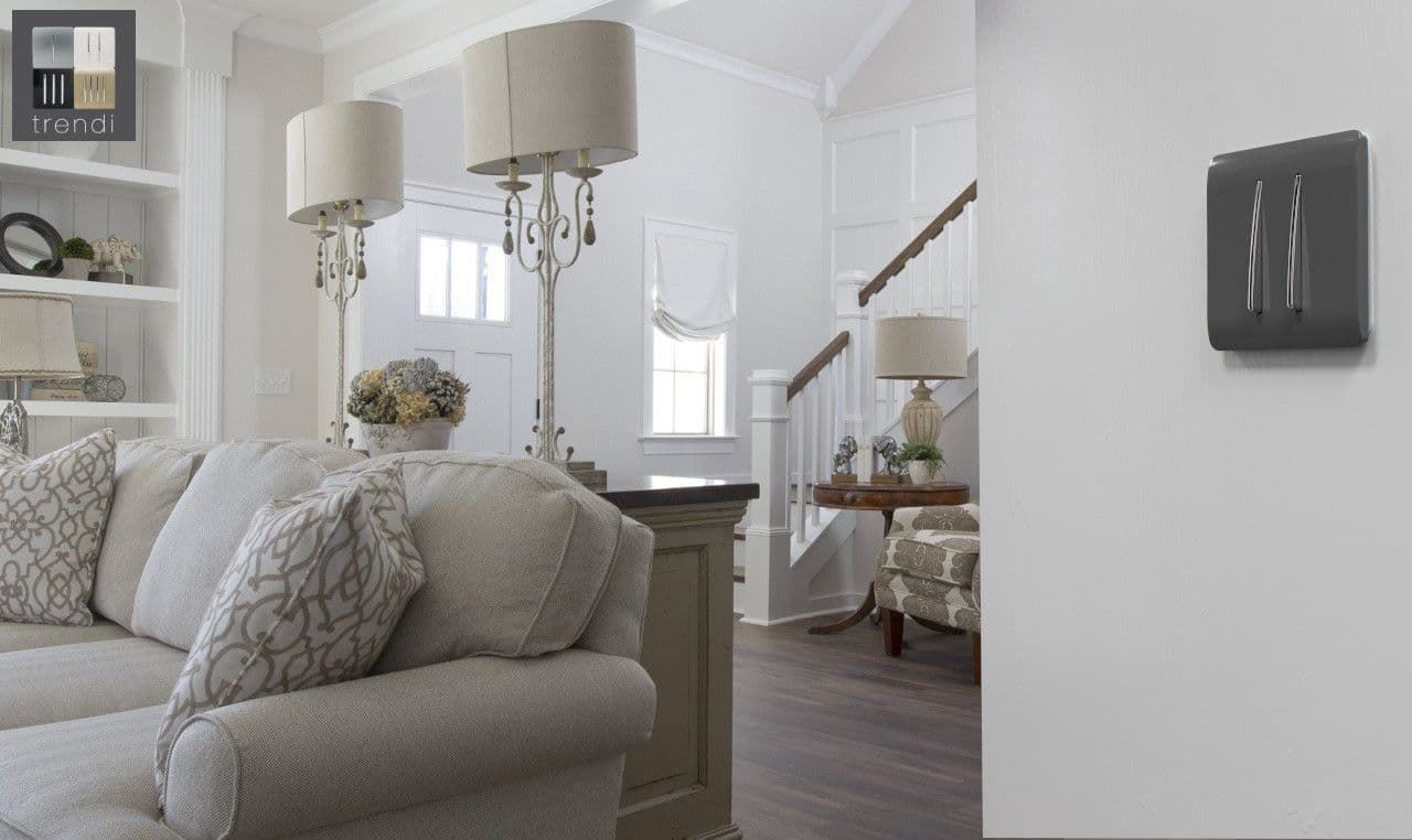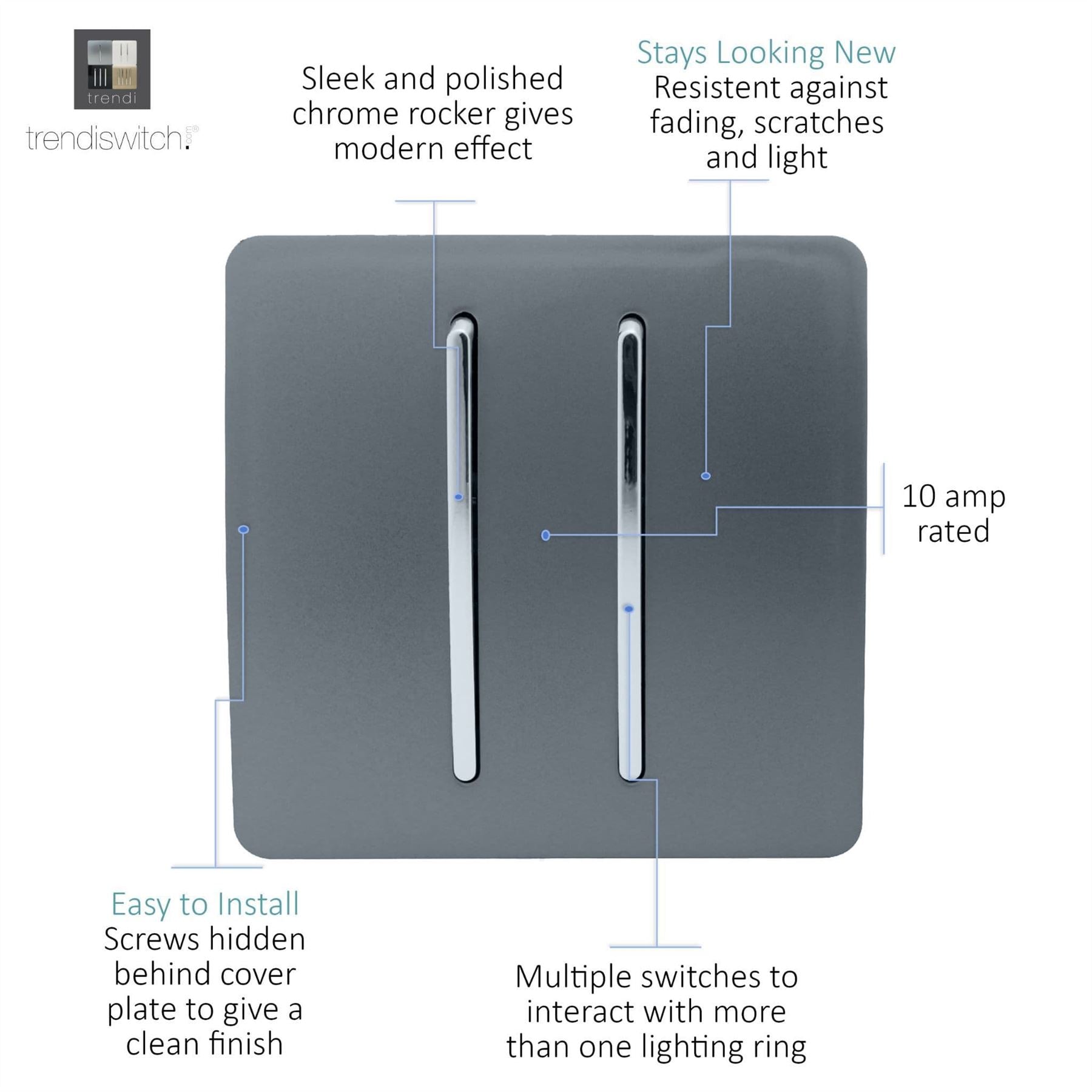 The Trendi Switch range of 2 gang intermediate (also known as 3 way) rocker light switches comprise of a sleek chrome rocker switch on a "screwless" plate displaying the complete colour of the products. This is supported by a back frame that houses the screw holes & module for the product to be installed into compatible back boxes and wiring.
