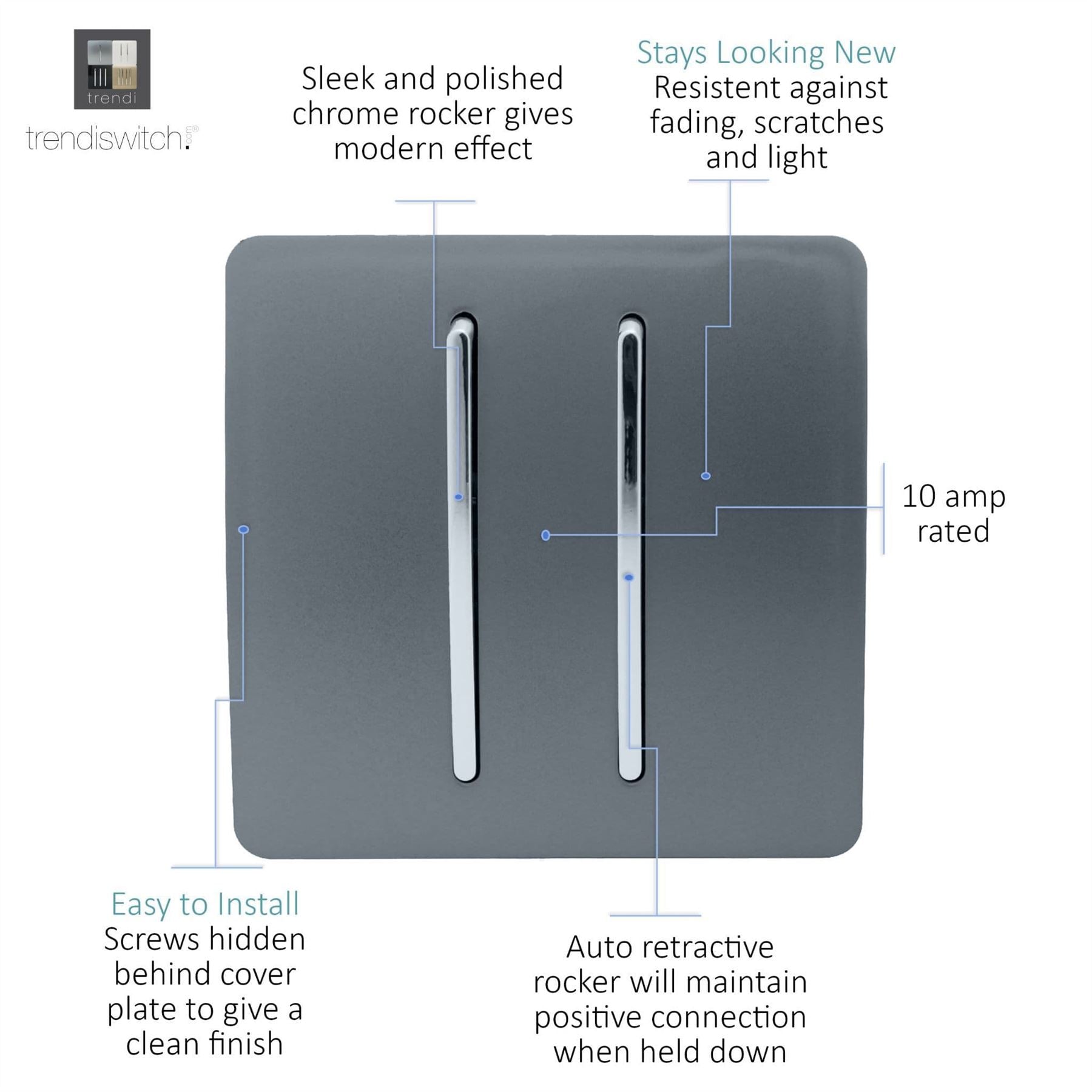 The Trendi Switch range of 2 gang retractive doorbell switches comprise of a sleek chrome rocker switch on a "screwless" plate displaying the complete colour of the products. This is supported by a back frame that houses the screw holes & module for the product to be installed into compatible back boxes and wiring.