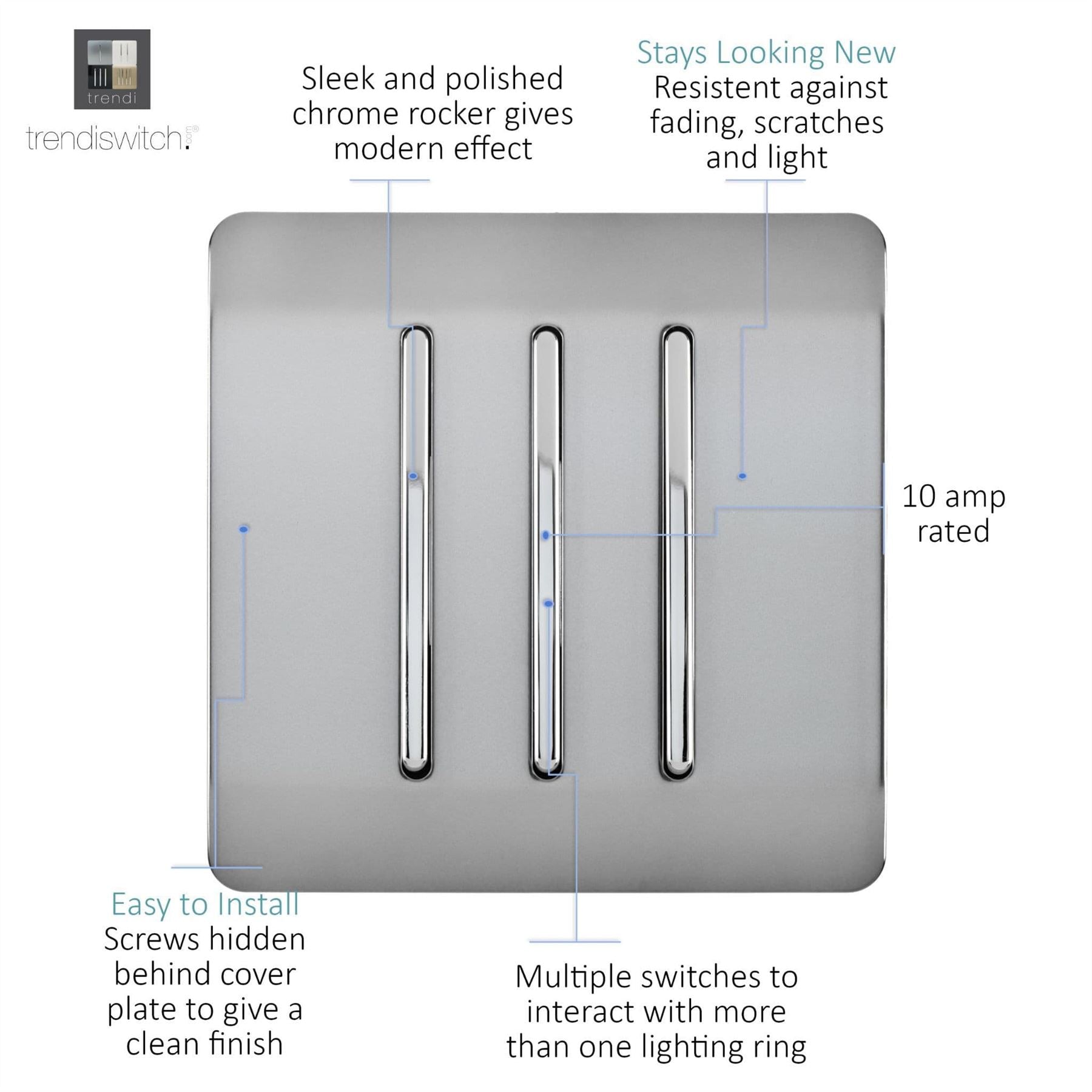 The Trendi Switch range of 3 gang 1 or 2 way rocker light switches comprise of a sleek chrome rocker switch on a "screwless" plate displaying the complete colour of the products. This is supported by a back frame that houses the screw holes & module for the product to be installed into compatible back boxes and wiring.