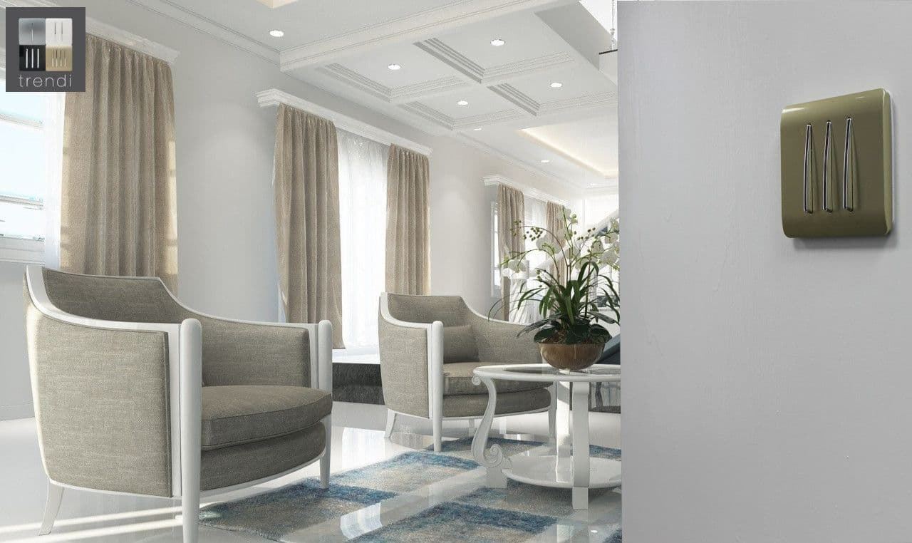 The Trendi Switch 3 Gang 1 or 2 Way Rocker Light Switch in Champagne Gold is a premium design feature from the Trendi Champagne Gold Collection, created to bring a clean and contemporary look to any home or commercial space. With its glossy Champagne Gold finish and modern screwless profile, this light switch offers a refined aesthetic that complements minimalist, luxury, and design-led interiors. Engineered for durability and easy installation, it is ideal for home renovations, new builds, smart home upgrades, and professional electrical projects. This switch supports 1 or 2 way switching and is suitable for controlling mains, low voltage, and LED lighting. It meets BS EN 60669 safety standards and does not require an earth connection, making it a reliable choice for domestic lighting circuits. Dimensions are 88 x 88 mm with a faceplate depth of 12 mm and an installation depth of 17 mm. Operating voltage is 220 to 250V AC with a maximum load rating of 10A. Choose Trendi for a stylish, screwless light switch that combines modern design with functionality, perfect for homeowners, electricians, interior designers, and architects.