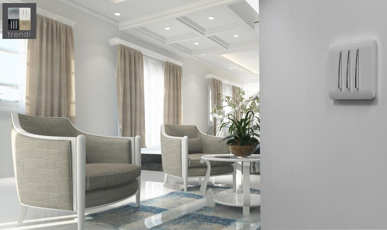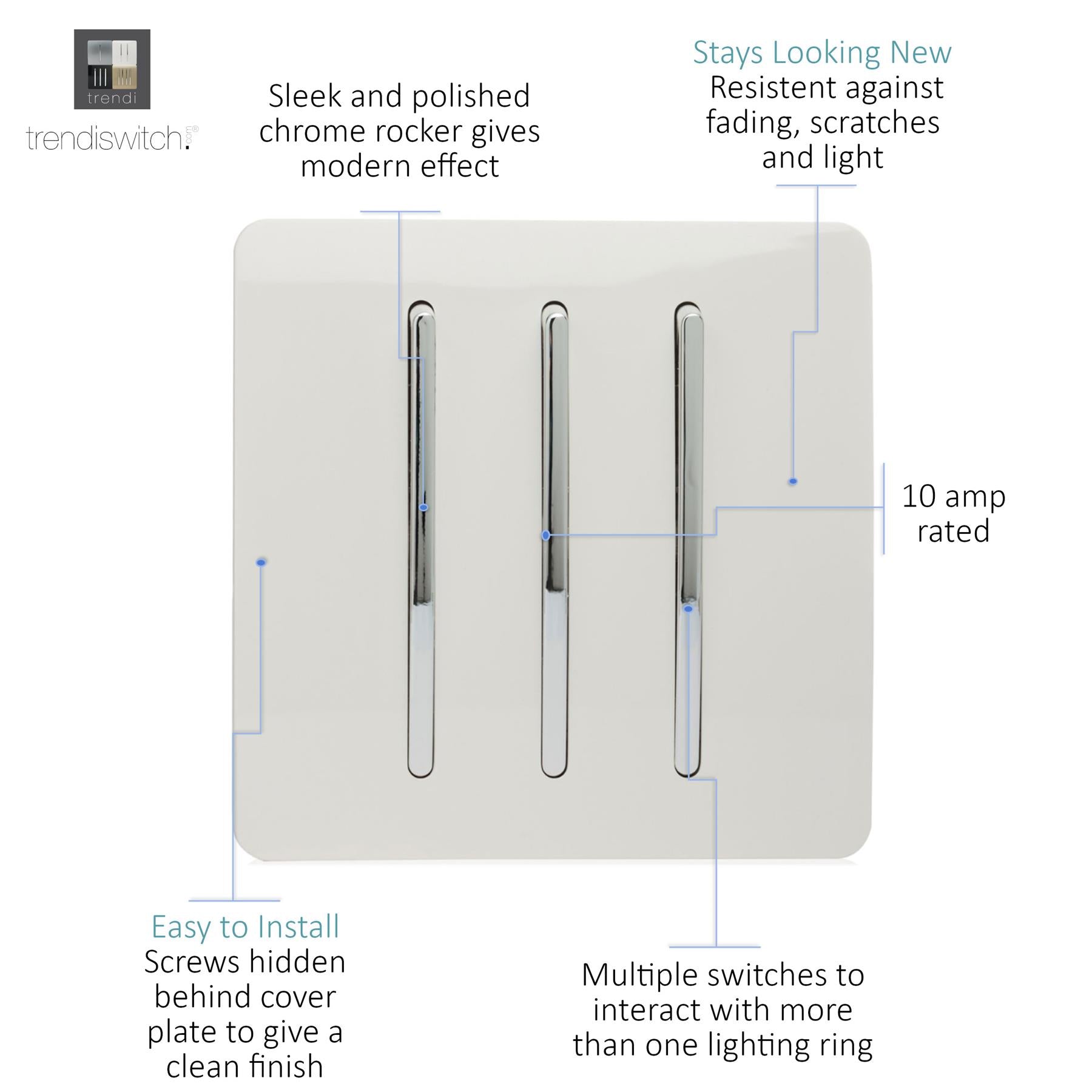The Trendi Switch range of 3 gang 1 or 2 way rocker light switches comprise of a sleek chrome rocker switch on a "screwless" plate displaying the complete colour of the products. This is supported by a back frame that houses the screw holes & module for the product to be installed into compatible back boxes and wiring.
