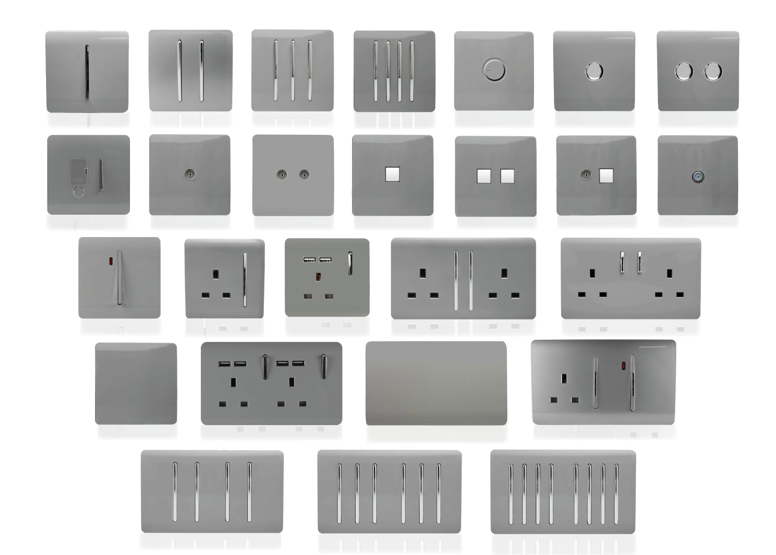 Upgrade your lighting with the Trendi Switch 4 Gang 2/Way 100w LED Dimmer Light Switch, a sleek and stylish solution for modern interiors. Designed for dimmable LED bulbs, this rotary push on/off dimmer offers smooth, reliable control with a maximum load of 5/100w LEDs. Crafted with a screwless faceplate and a premium chrome dimmer knob, the Trendi LED dimmer switch is as functional as it is elegant / making it the perfect choice for contemporary homes. Key Features: Product Colour: Light Grey 4/Gang 2/Way Push On/Off Rotary LED Dimmer (5/100w LED load capacity) Ideal for LED lighting / tested for 0/10 dimmable LED bulbs Chrome knob finish for a premium designer look Screwless faceplate with included back and front plates Ultra/slim profile: 146 x 89 x 48mm (Faceplate depth: 8mm) Lightweight and durable: 250g Easy installation / fits a 25mm back box Operating voltage: 220/250V AC 5/Year Warranty / British made, certified & tested to BS EN 60669/2/1 Safe for indoor, domestic lighting circuits Safety Information: For indoor use only Use only with dimmable LED light bulbs (not suitable for non/dimmable fluorescents, wire/wound or toroidal transformers, TRIAC dimmable loads, or electric motors) Do not overload the switch The Trendi Switch LED Dimmer combines modern design with advanced functionality, giving you a reliable and stylish lighting solution. Whether you're upgrading a single room or renovating your entire home, this designer chrome dimmer switch adds a touch of elegance to any space / #definedbydesign.