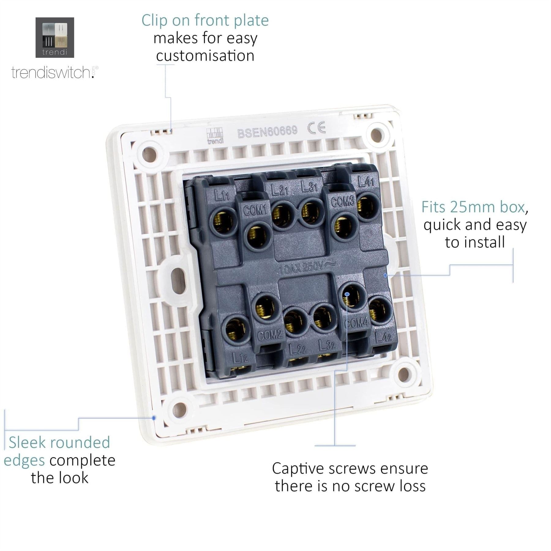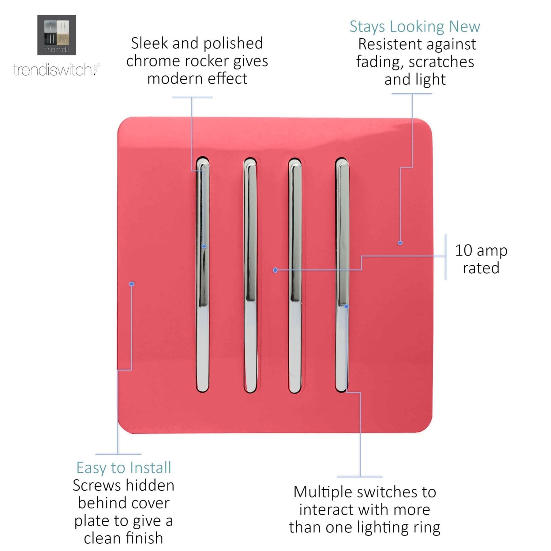 The Trendi Switch range of 4 gang 1 or 2 way rocker light switches comprise of a sleek chrome rocker switch on a "screwless" plate displaying the complete colour of the products. This is supported by a back frame that houses the screw holes & module for the product to be installed into compatible back boxes and wiring.