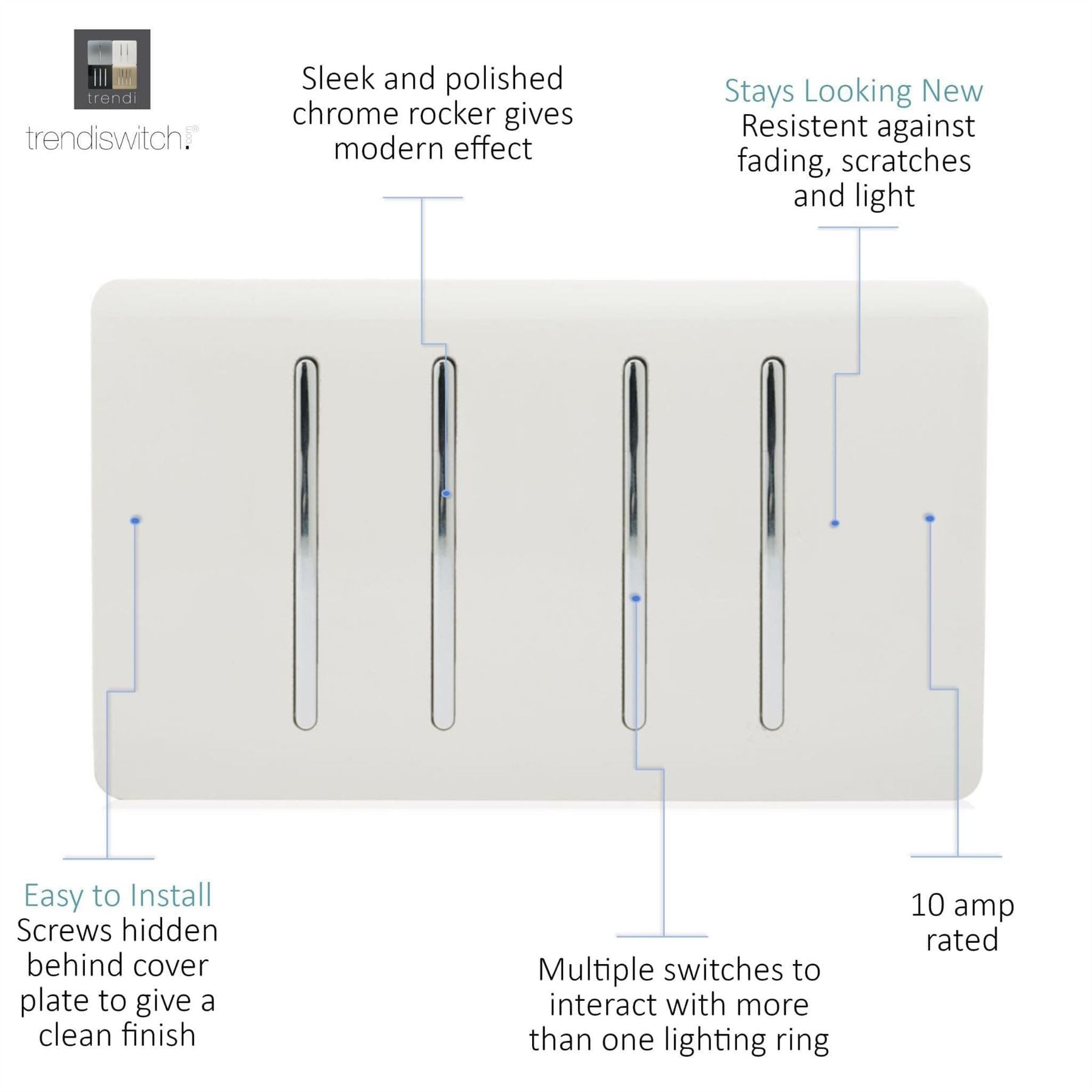 The Trendi Switch range of 4 gang intermediate (also known as 3 way) rocker light switches comprise of a sleek chrome rocker switch on a "screwless" plate displaying the complete colour of the products. This is supported by a back frame that houses the screw holes & module for the product to be installed into compatible back boxes and wiring. This version is constructed on a double size plate.