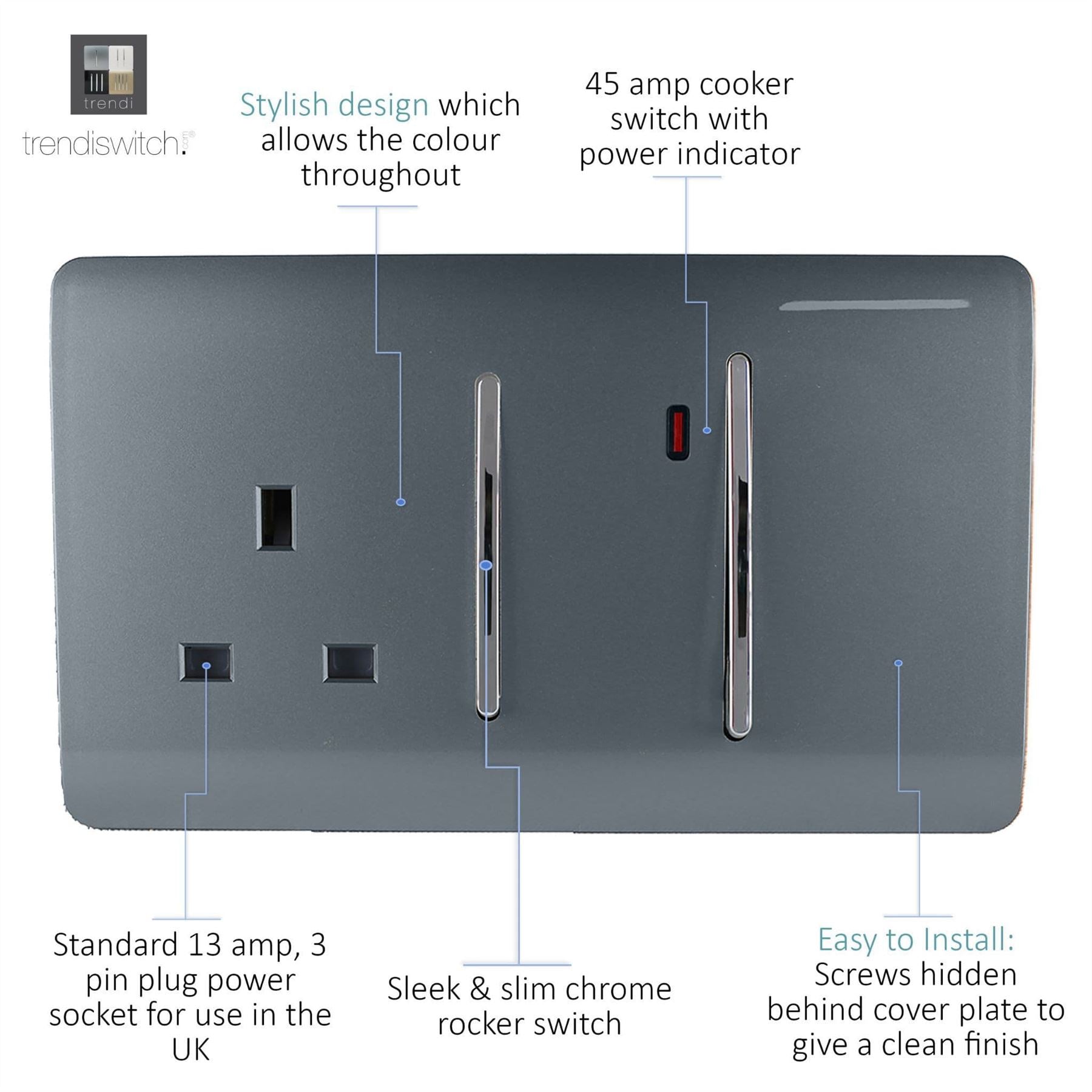 The Trendi Switch range of 45 amp cooker switches including 13 amp plug sockets comprise of a sleek chrome rocker switch on a "screwless" plate displaying the complete colour of the products. This is supported by a back frame that houses the screw holes & module for the product to be installed into compatible back boxes and wiring.