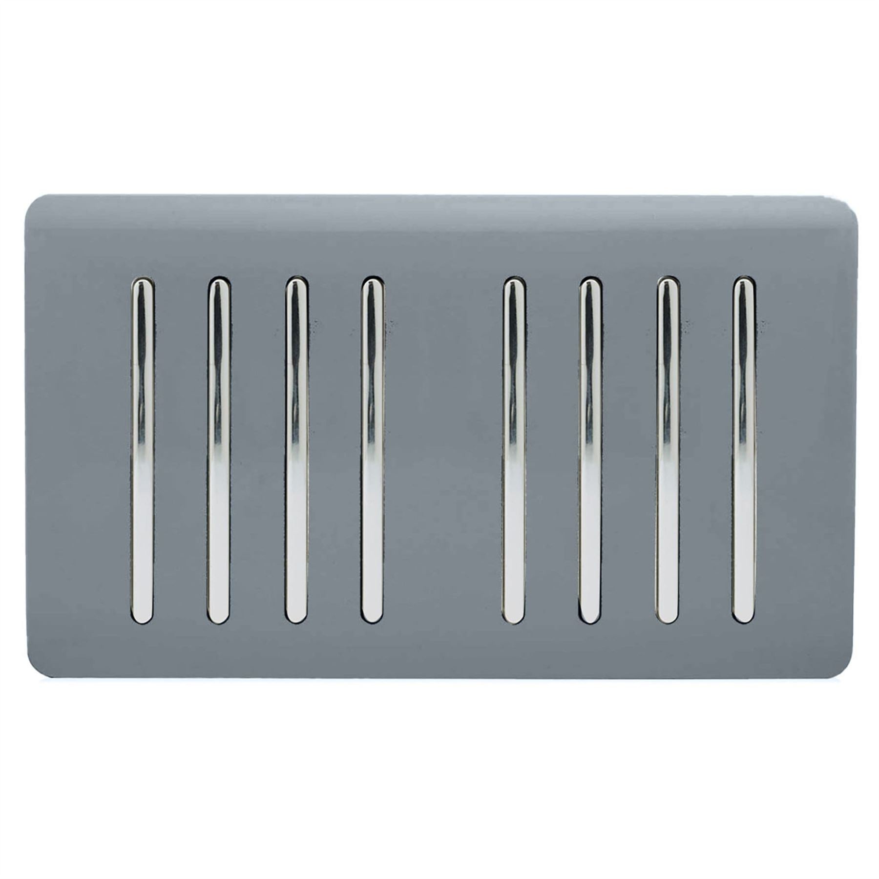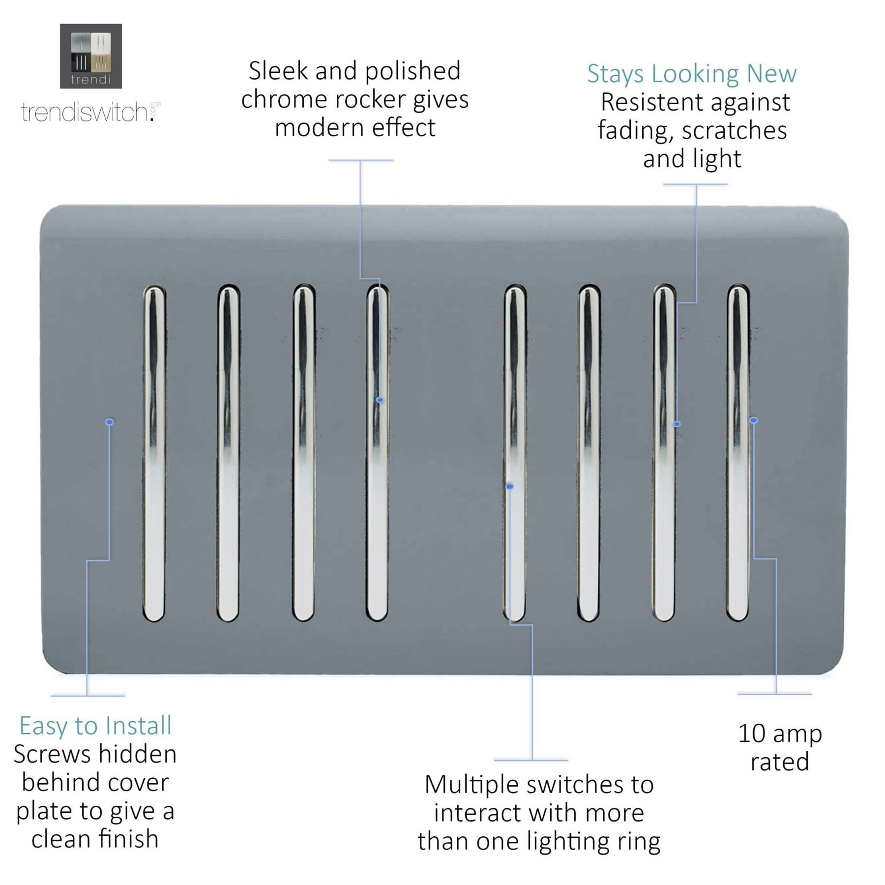 The Trendi Switch range of 8 gang 1 or 2 way rocker light switches comprise of a sleek chrome rocker switch on a "screwless" plate displaying the complete colour of the products. This is supported by a back frame that houses the screw holes & module for the product to be installed into compatible back boxes and wiring. This version is constructed on a double size plate.