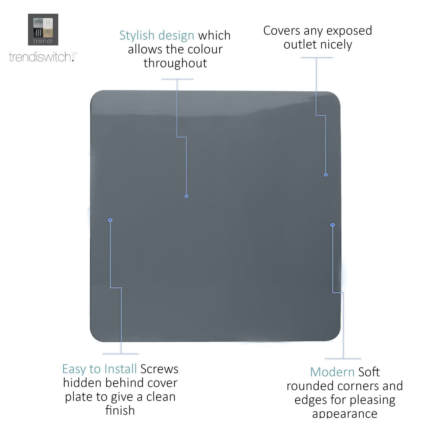 The Trendi Switch range of blanking plates comprise of a "screwless" plate displaying the complete colour of the products. This is supported by a back frame that houses the screw holes for the product to be installed into compatible back boxes.